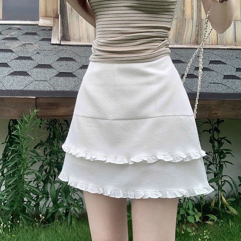 大码韩系藏青色双层木耳边高腰辣妹半身裙女夏季新款显瘦A字短裙