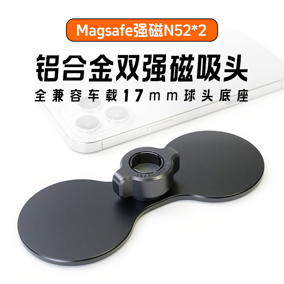 双机位磁吸头Magsafe强磁头铝合金材质17mm球头中控台出风口通用