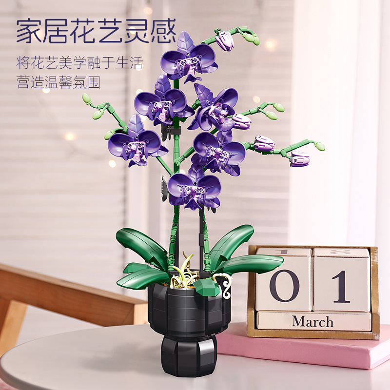 クロスボーダービルディングブロック Huajie Star 新製品 JJ9235 オーキッド紫韻シミュレーション蘭鉢植えデスクトップ装飾ホリデーギフト