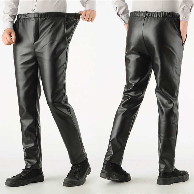 秋冬の男性用伸縮性ウエストレザーパンツ、ベルベットと厚みのある中高年向けのハイウエスト暖かいメンズ防水性と耐油性のPUレザーパンツ