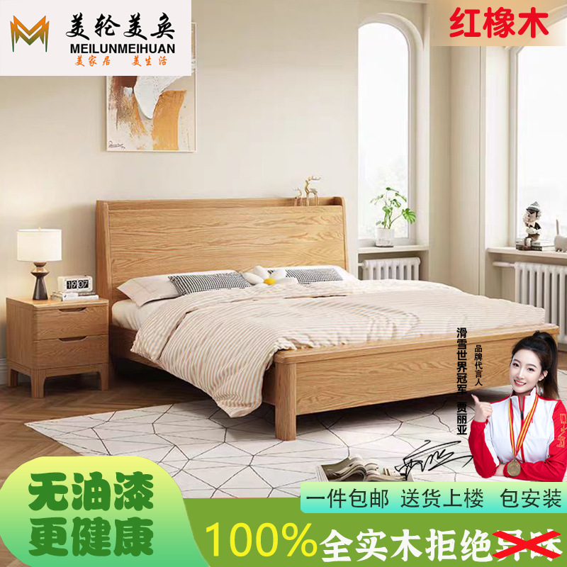 北欧スタイルの全無垢材ベッドモダンシンプルレッドオーク 1.8m ダブルベッド寝室 1.5m 子供用シングルベッド