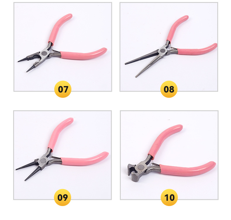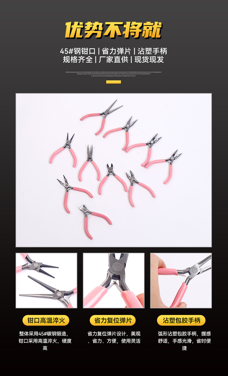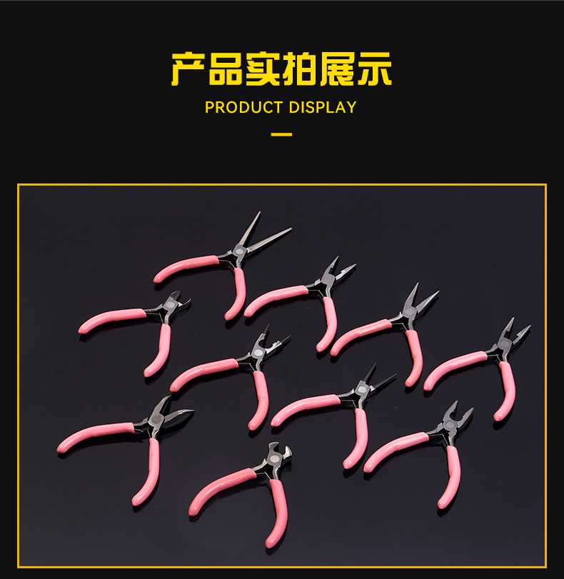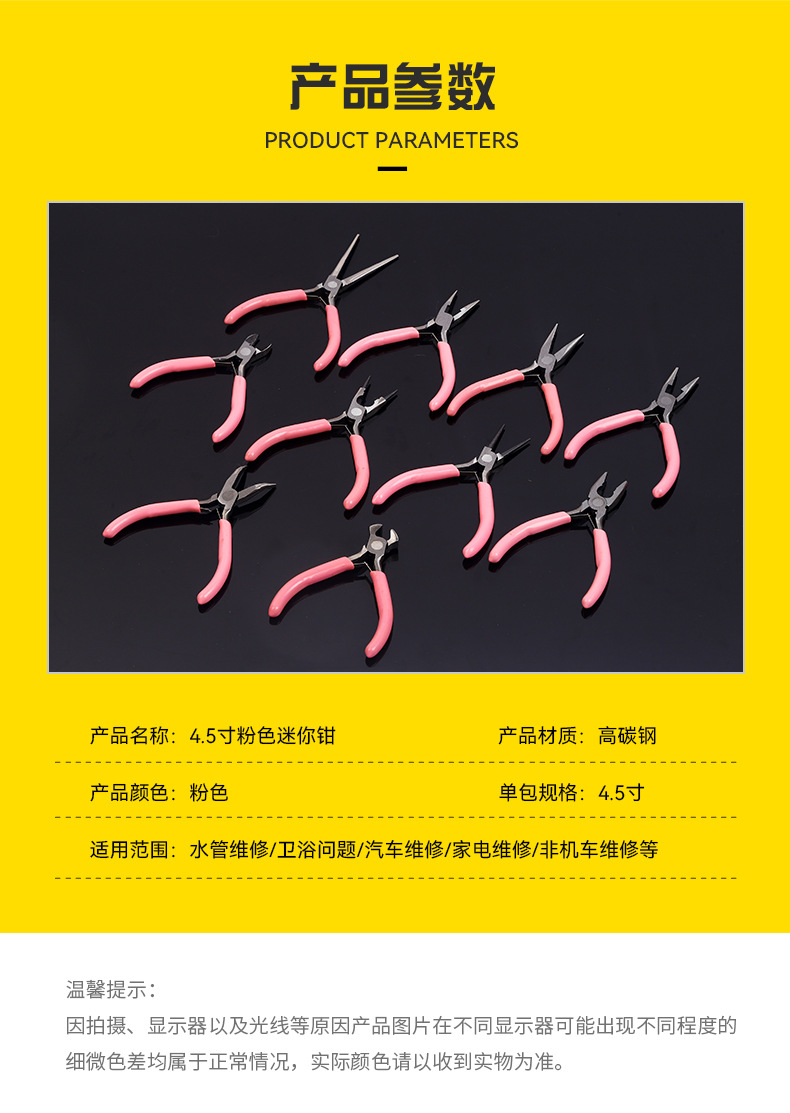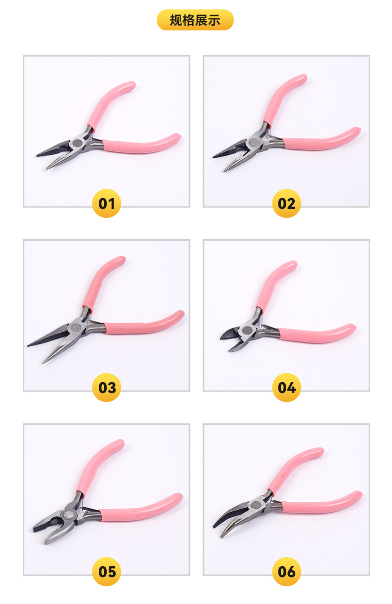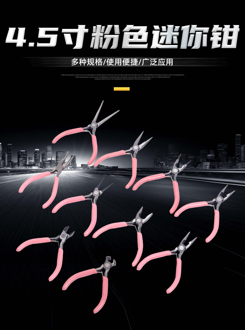 型号 4.5寸粉色有牙尖嘴钳,4.5寸粉色无牙尖嘴钳,4.5寸粉色圆嘴钳,4.5寸粉色斜口钳,4.5寸粉色钢丝钳,4.5寸粉色顶切钳,4.5寸粉色弯嘴钳,4.5寸粉色无牙无刃尖嘴钳,4.5寸粉色针嘴钳,4.5寸粉色珠宝钳,塑料焊枪