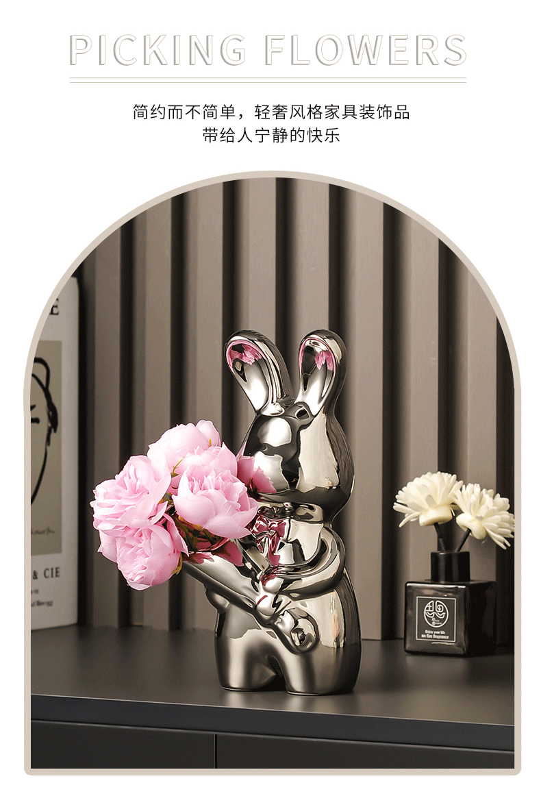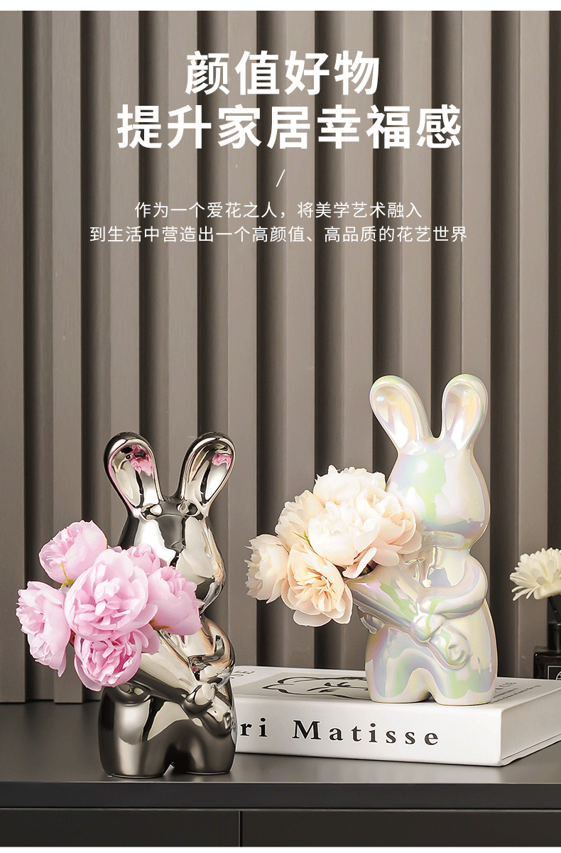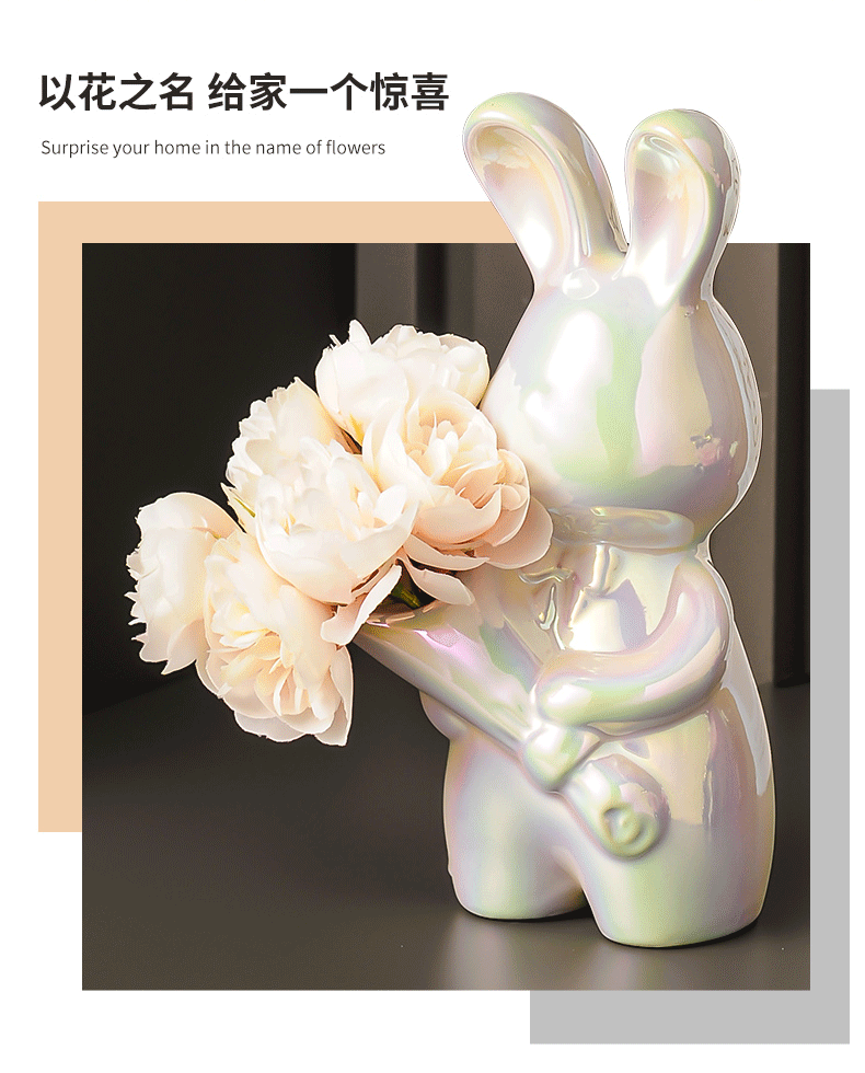 创意艺术兔子陶瓷花瓶摆件客厅玄关酒柜装饰品摆件插花高级感花瓶