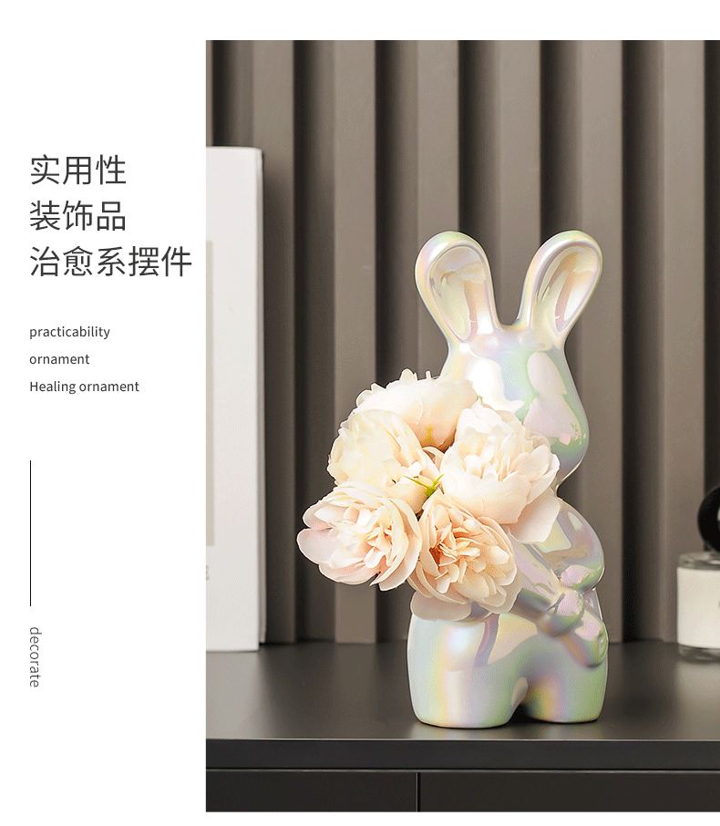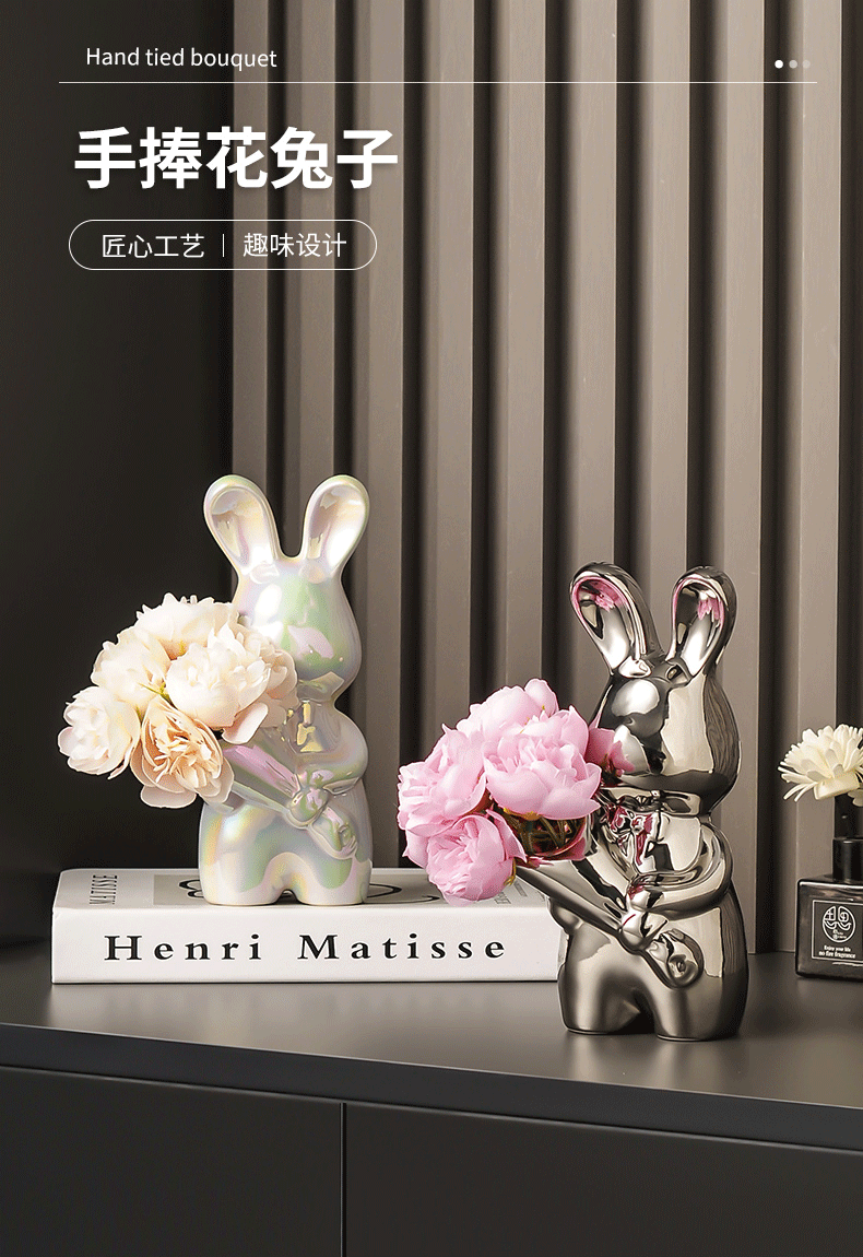 跨境艺术兔子陶瓷花瓶摆件客厅玄关酒柜装饰品摆件插花高级感花瓶