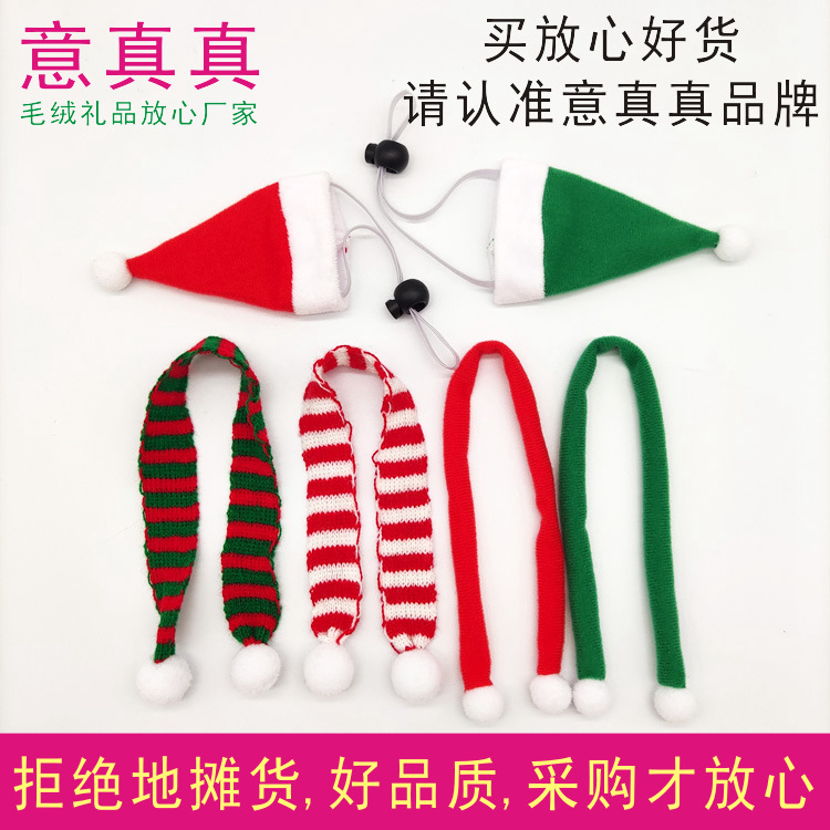 ミニペットのクリスマス帽子と赤と白の赤と緑のマフラーの蝶ネクタイとゴムロック付きの赤と緑の小さな帽子