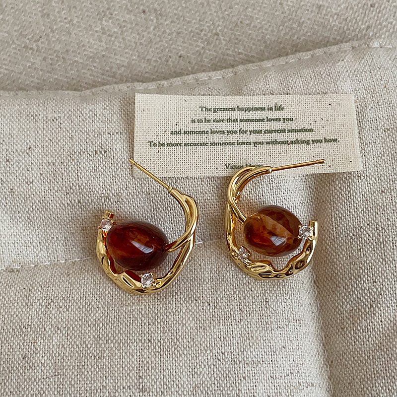 美拉德琥珀色椭圆树脂金属耳钉女高级感轻奢复古时尚潮流耳环耳饰