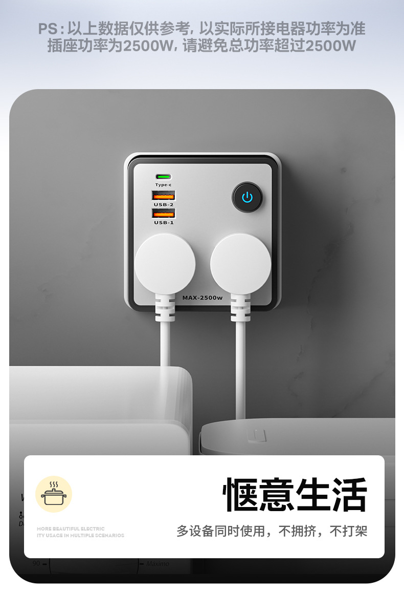 86型 新款拼色夹缝扩展插板无线带开关USB家用插座一转多孔转换器