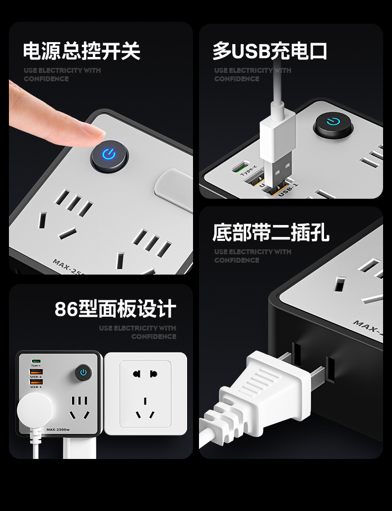 智能插座转换器插头多功能86型带USB插排插板家用多孔一转多电源