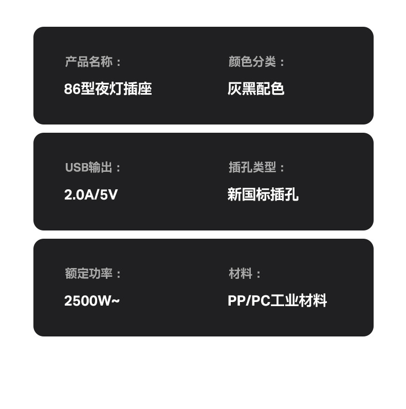 规格型号 86型白灰【普通款】,86型白灰【夜灯款】,86型白灰【USB款】,86型白灰【USB+夜灯款】,一转二-小功率-无开关