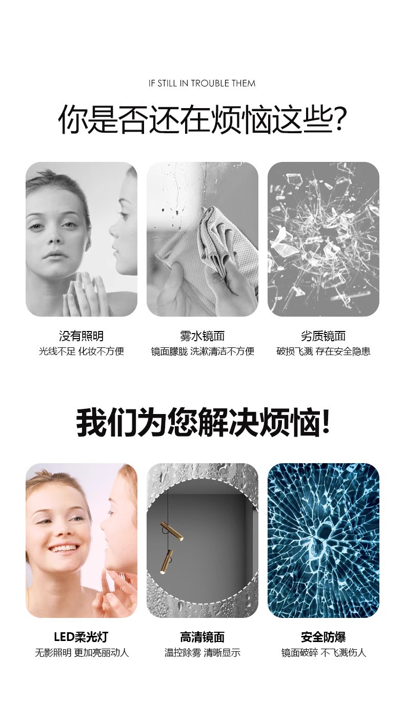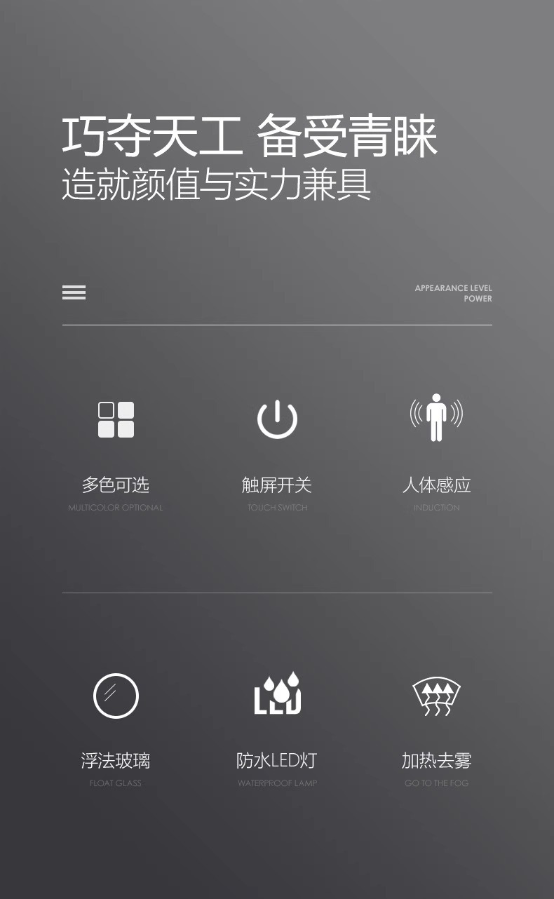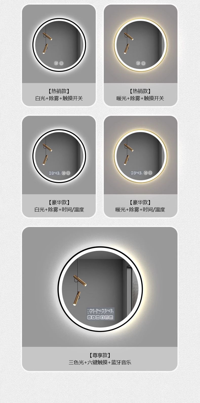 颜色 【金框】单触摸三色+调节亮度,【黑框】单触摸三色+调节亮度,【金框】除雾+触摸+三色调节,【黑框】除雾+触摸+三色调节,【金框】时间显示+除雾+三色调节,【黑框】时间显示+除雾+三色调节