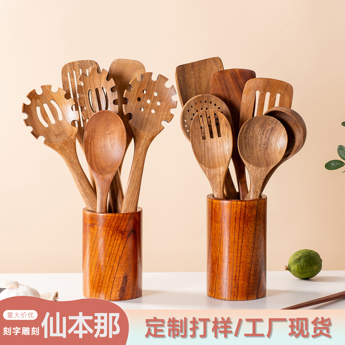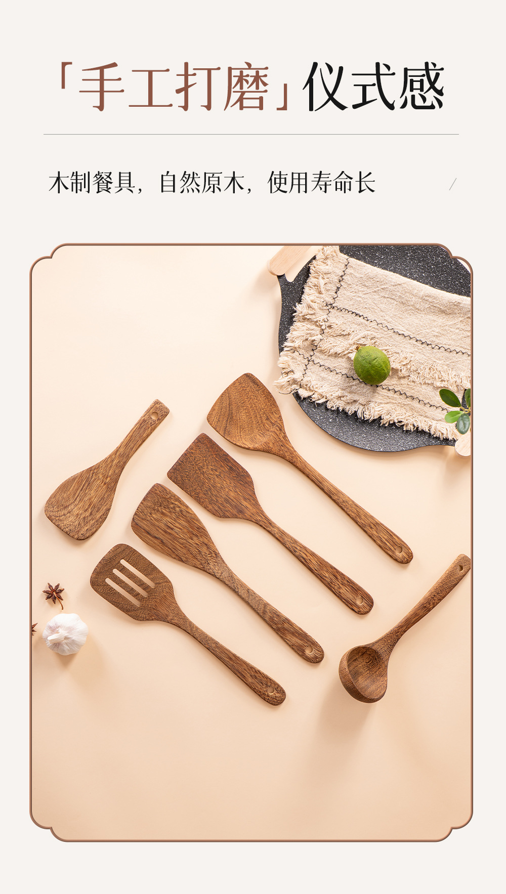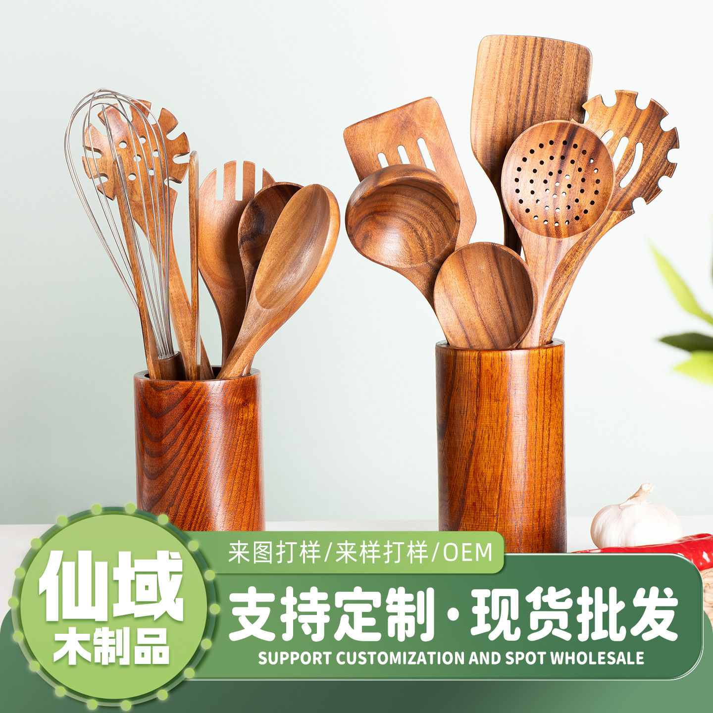 跨境烹饪厨具长柄锅铲汤勺套件满木沙拉勺亚马逊实木勺铲