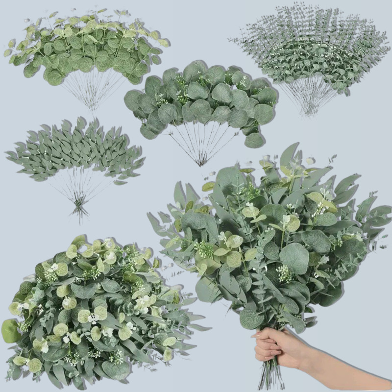 お金の葉ユーカリの葉のシミュレーション緑の植栽の単一の小さい花束の5叉insの花の材料の結婚祝いの生け花の部品の配材
