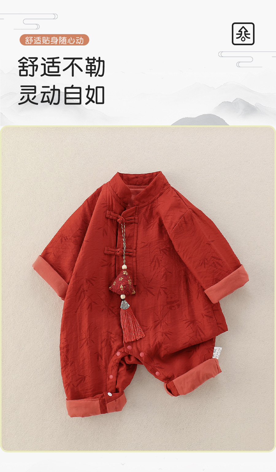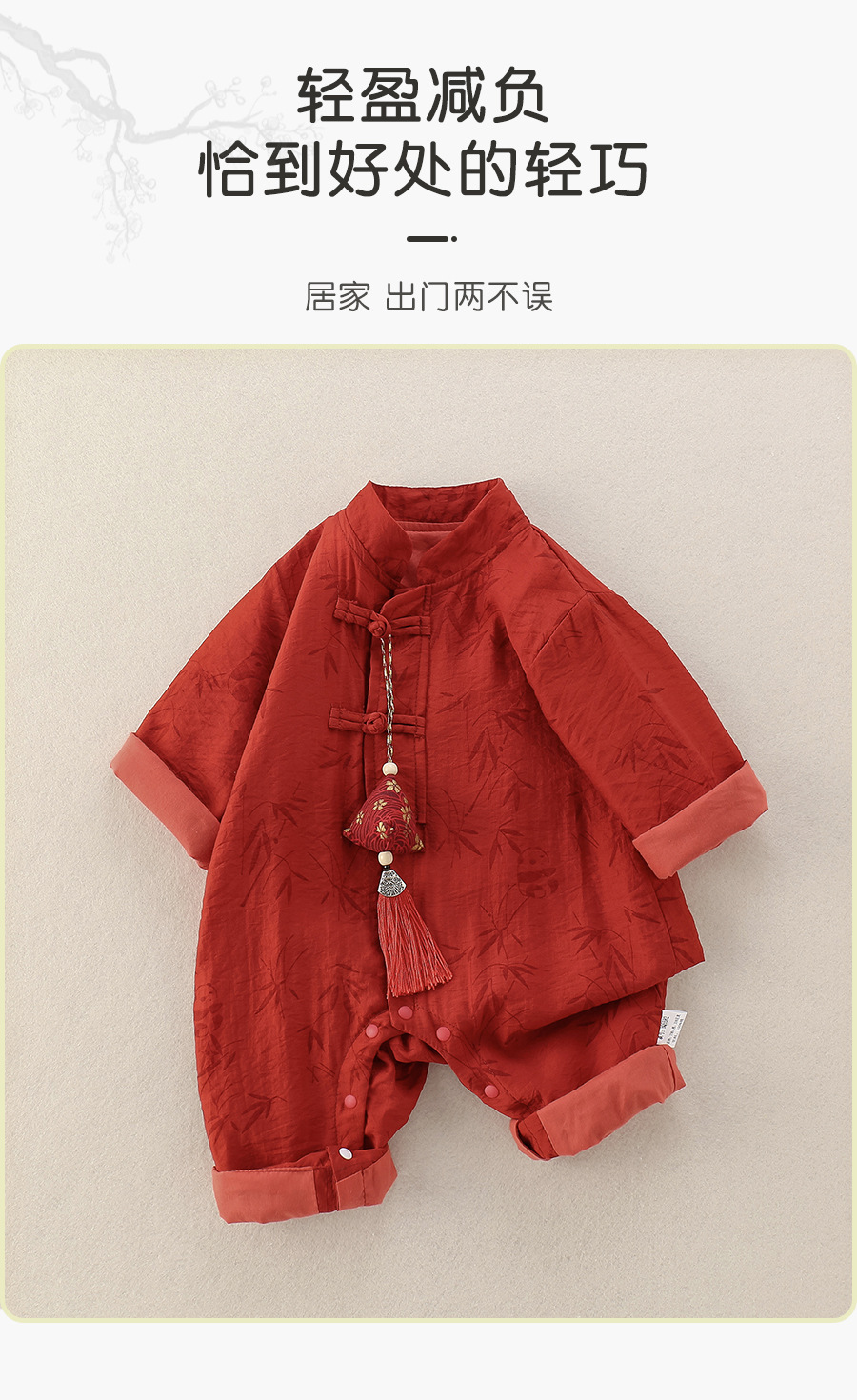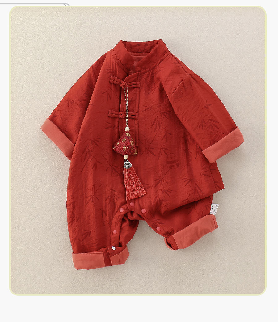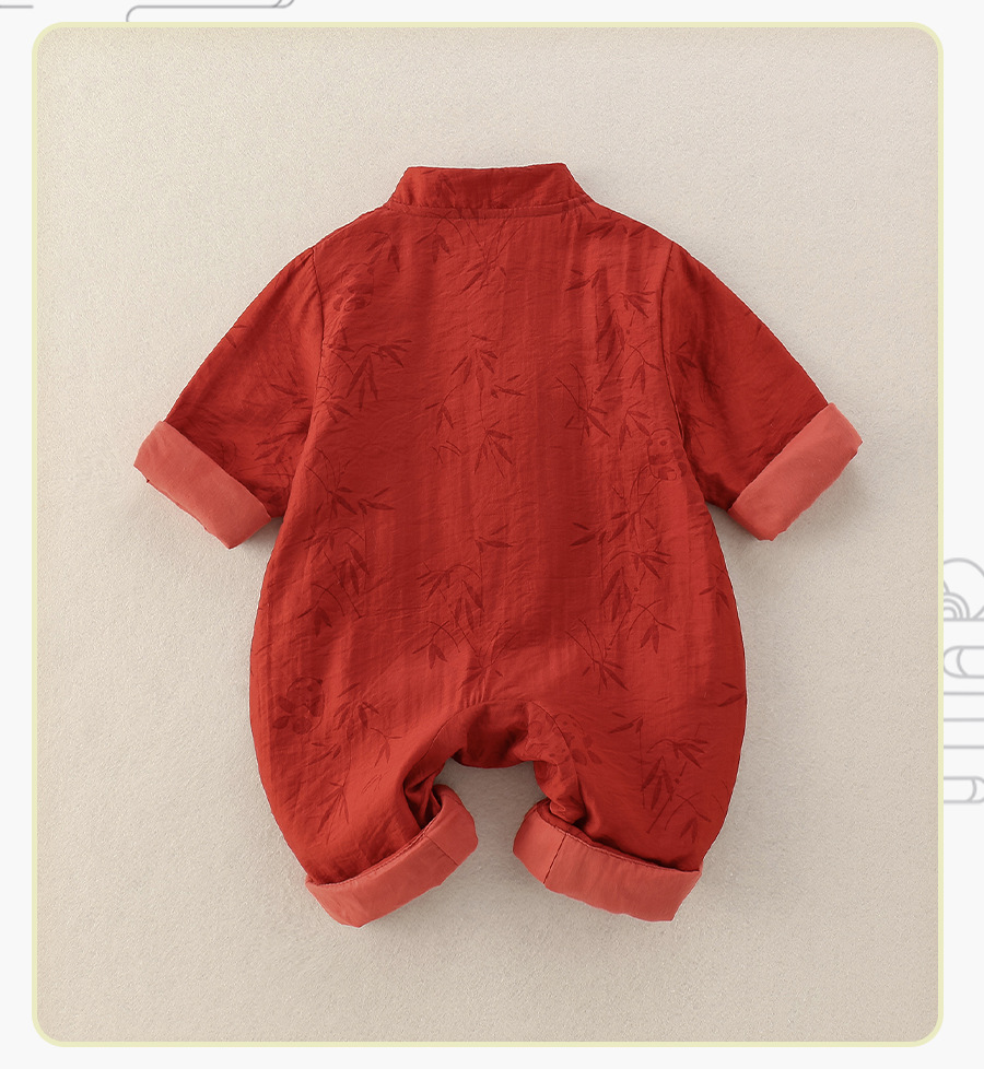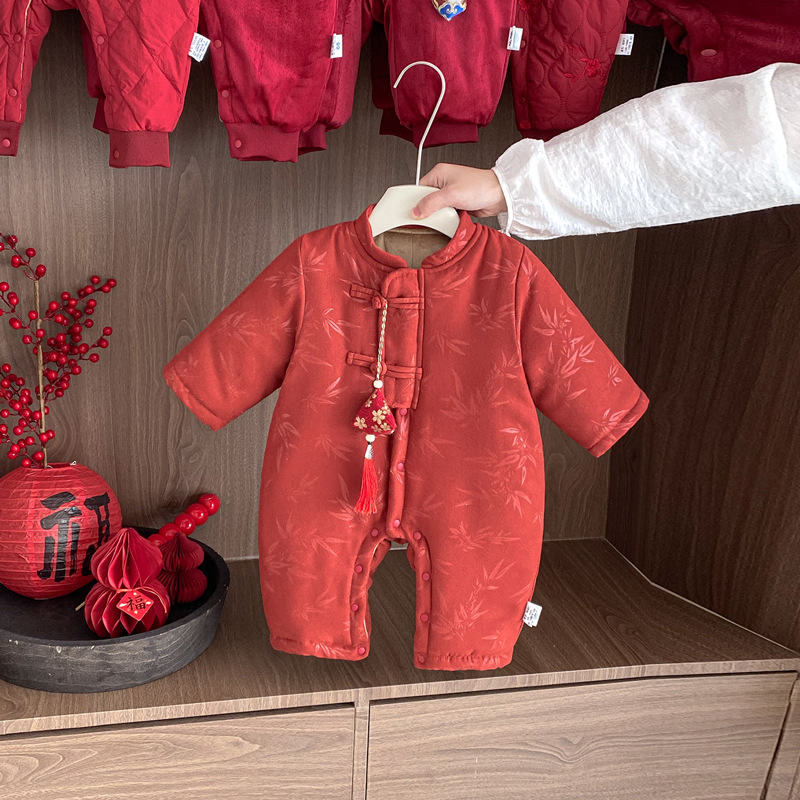 宝宝中国风连体衣秋冬加绒红色唐装汉服爬服竹印花婴儿满月周岁服