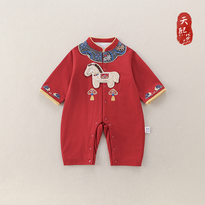 婴儿马年新年装春秋衣服宝宝红色连体衣满月百天中国风薄款拜年服