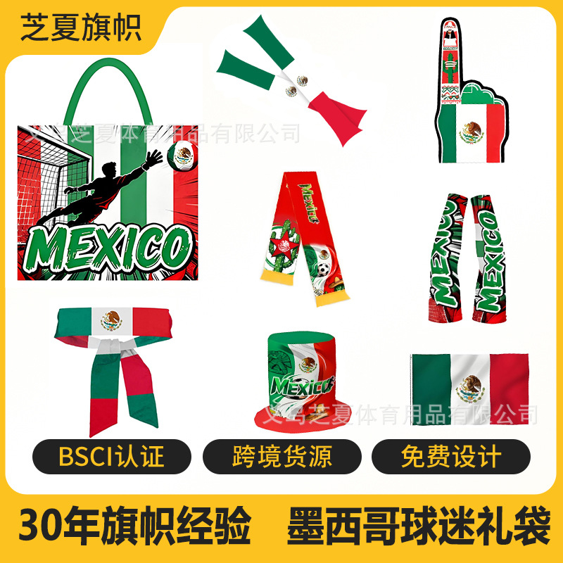 2026美加墨世界杯新款墨西哥球迷礼袋加油棒发带眼镜车旗围巾冰袖