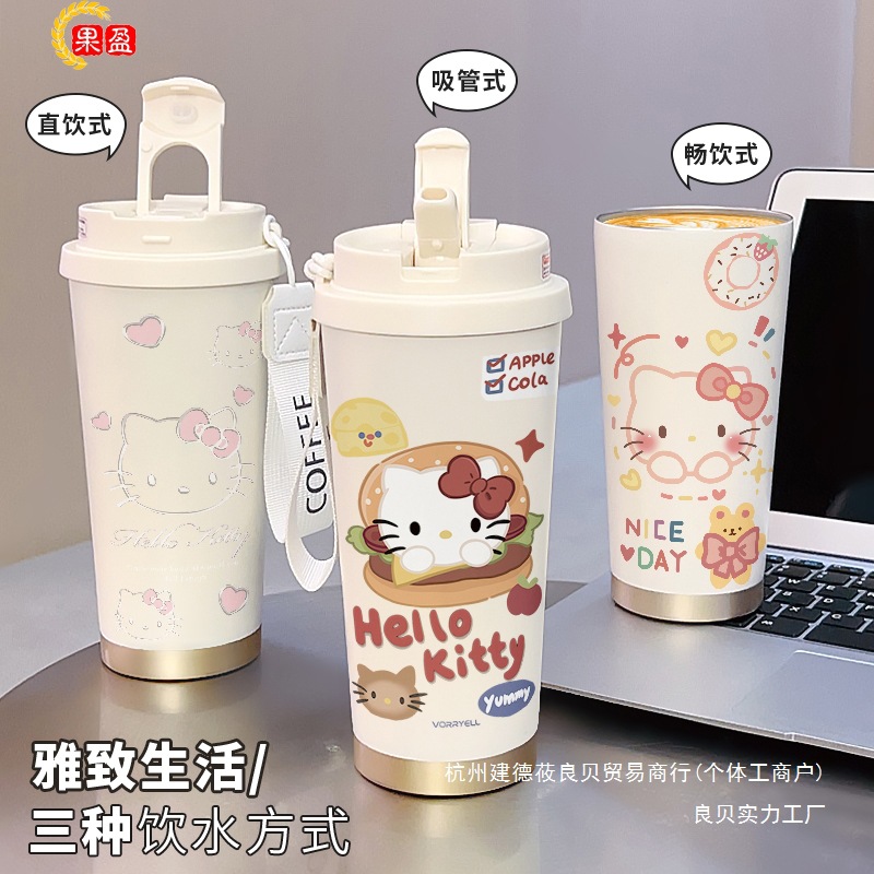 果盈凯蒂猫可爱咖啡杯学生保温杯大容量316陶瓷不锈钢水杯新款女