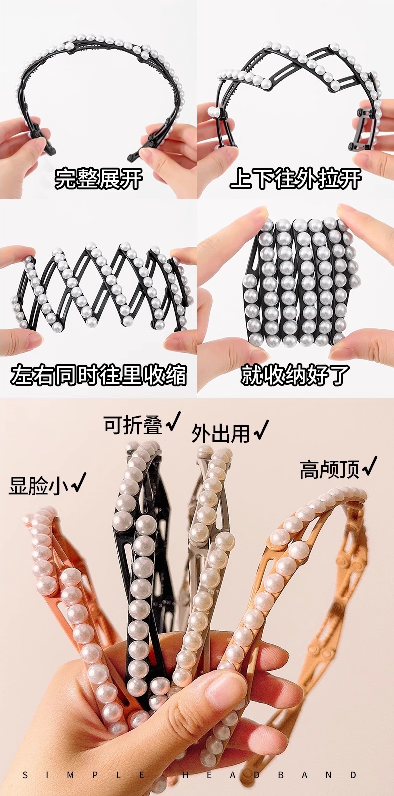 女の子用ビーズ折りたたみヘッドバンド 2025 新しい洗顔ヘッドバンド前髪額の切れ毛固定ヘッドバンド夏の帽子