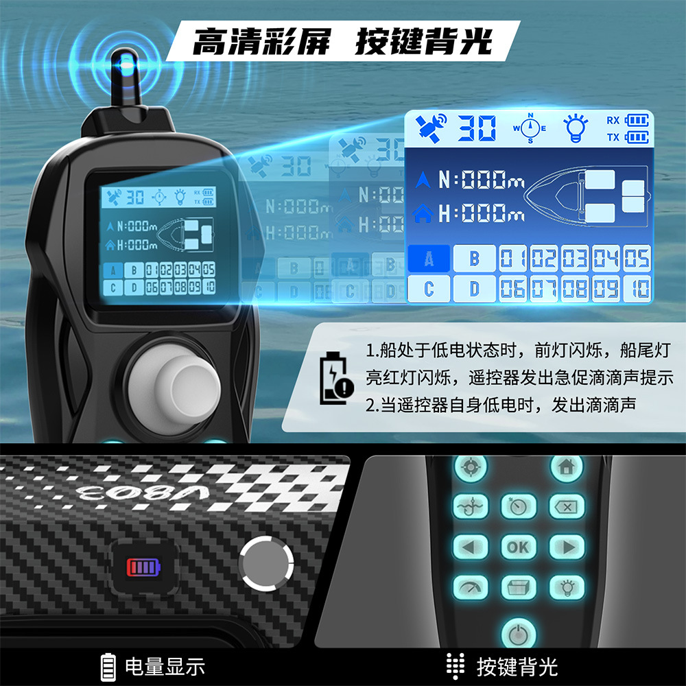 支持前进、后退、左转、右转,操作灵活,适应多种水域环境。内置高精度陀螺仪,自动修正偏航,确保航行稳定。