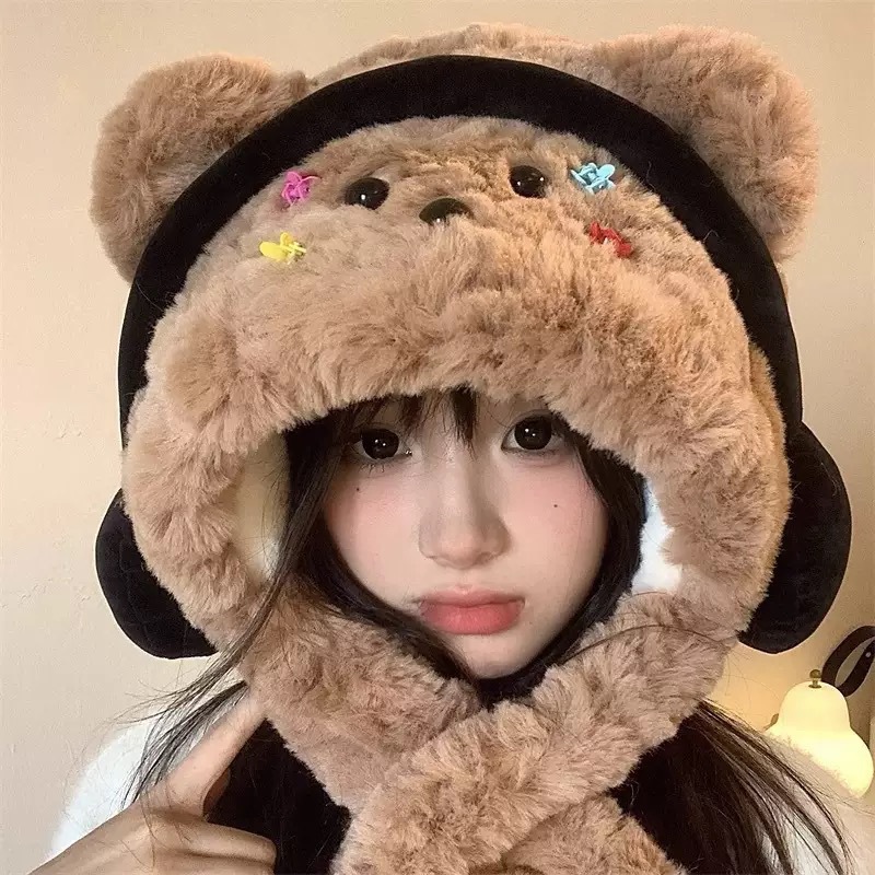 ぬいぐるみクマの帽子女性のための秋と冬 2025 新しいかわいい顔が見える小さな防風暖かい耳保護多用途プルオーバー帽子