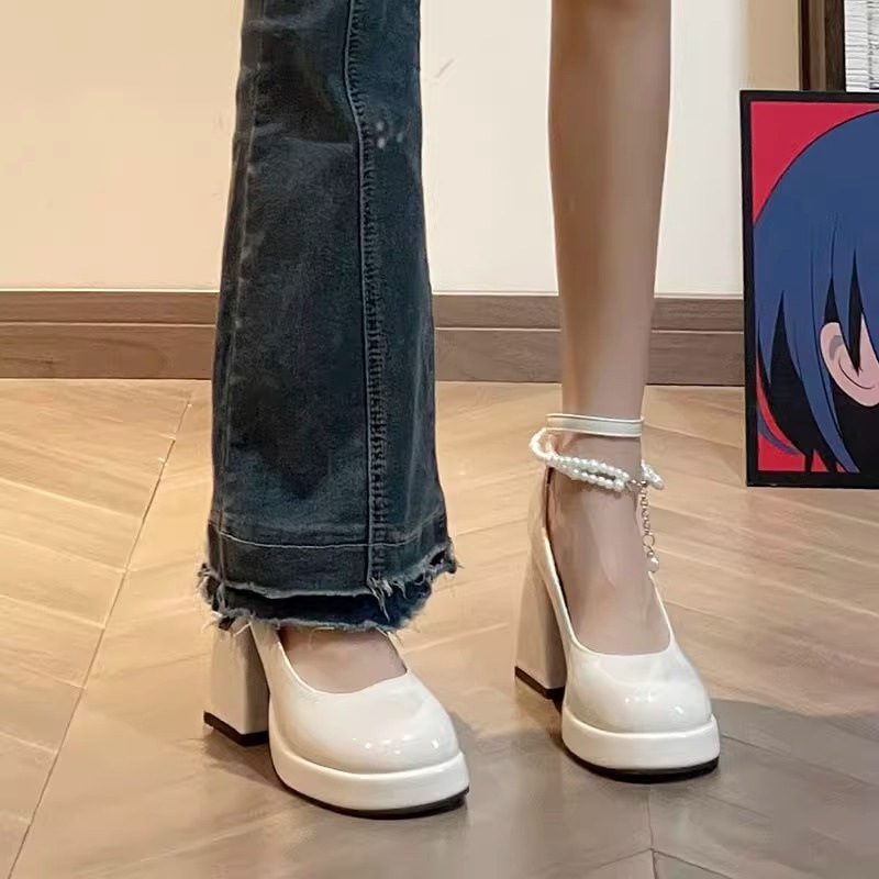 フランス風真珠アンドロメダ風花嫁靴メアリージェーン靴防水台ハイヒール女性一字バックル太ヒール靴