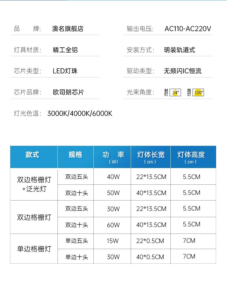 色温 单边五头 15W,单边十头 20W,单边十五头 28W,双边五头-24W,双边十头30W,双边十五头36W,三边发光五头32W,三面发光十头40W,三面发光十五头72W