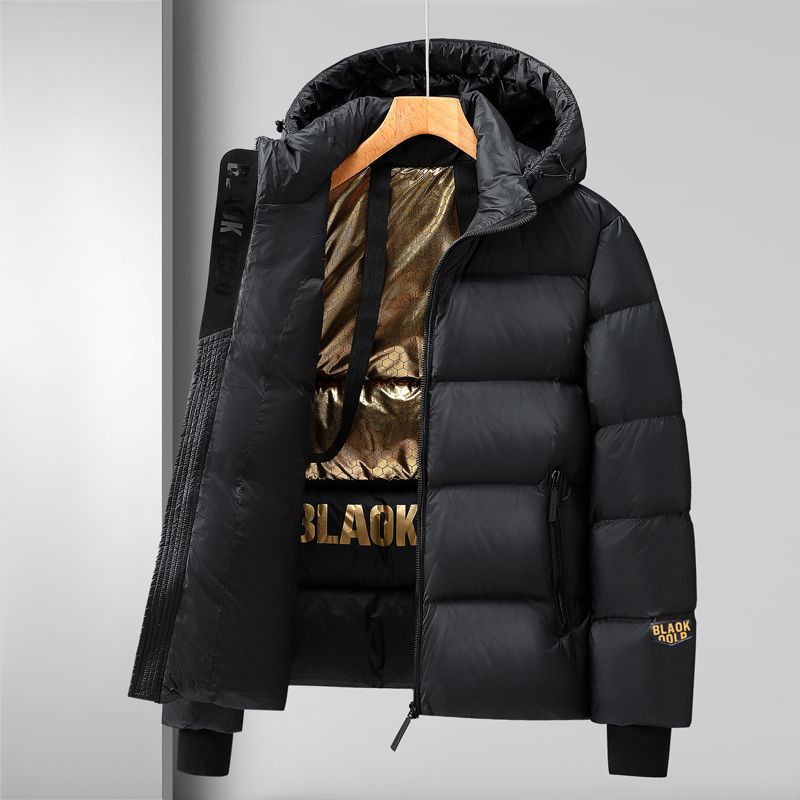 黒金の短いタイプの帽子付きダウンジャケット男女同タイプの厚い保温男性カップルコート冬のアウトドアパン服