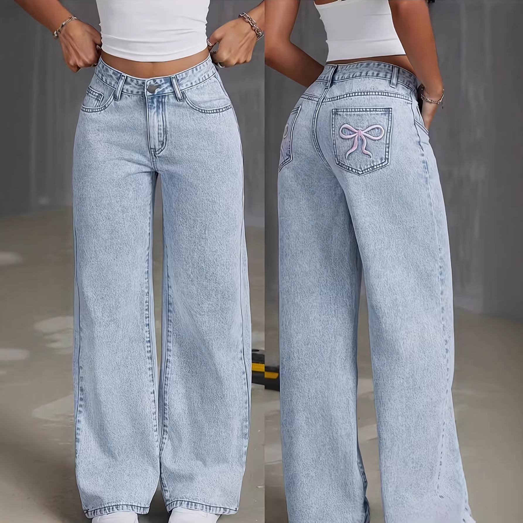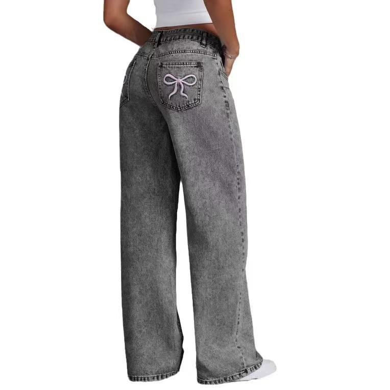 跨境SHEIN亚马逊蝴蝶结刺绣牛仔裤女甜辣风高腰直筒裤宽松长裤