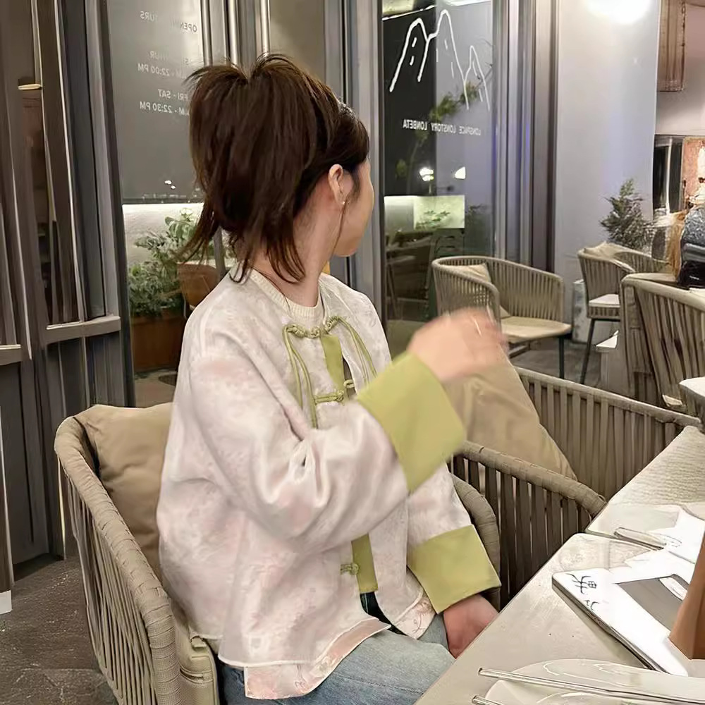 2024春夏款新中式元气粉绿提花盘扣圆领国风改良唐装上衣外套女