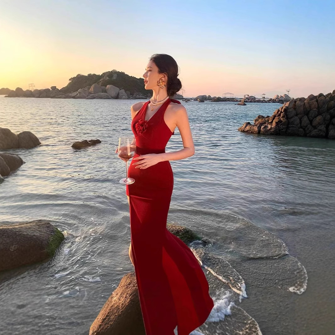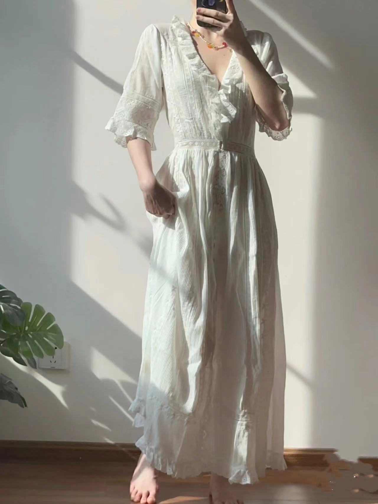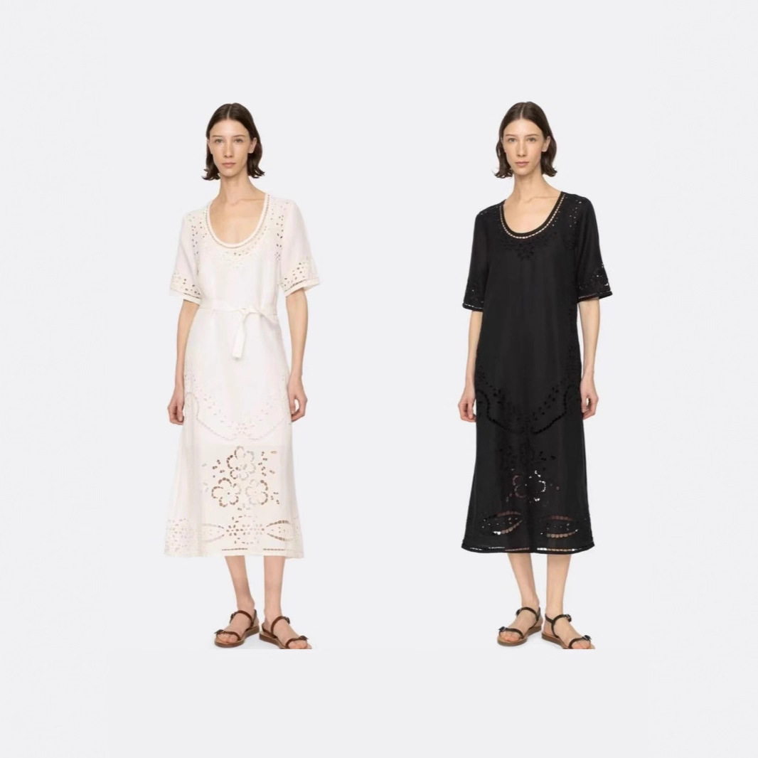 法式优雅25早秋新珍珠白优雅绣花镂空V领七分袖连衣裙