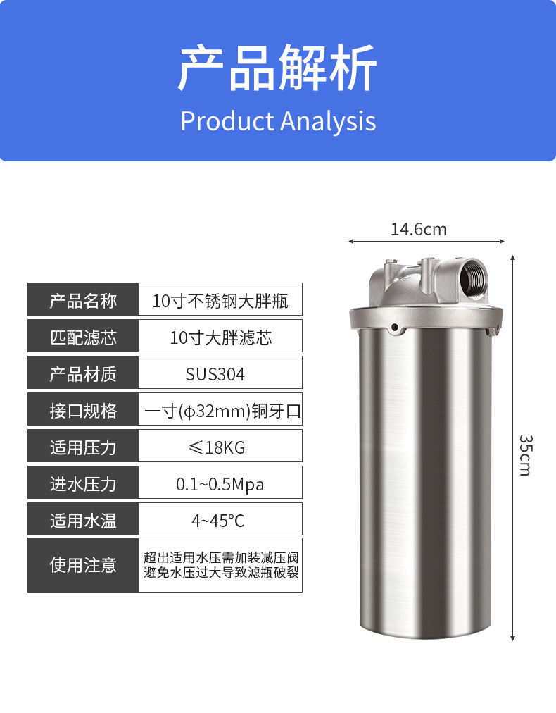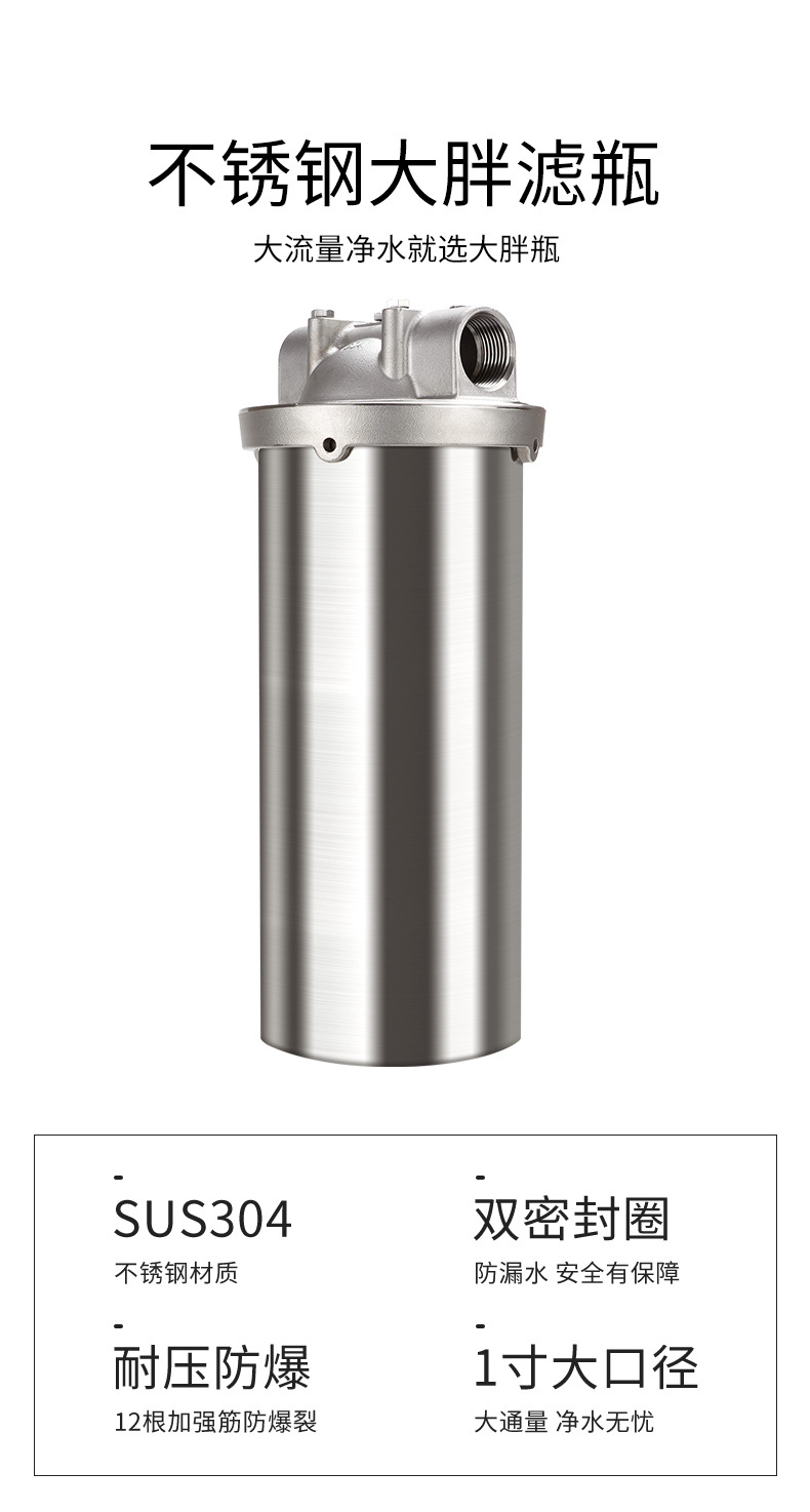 全屋大流量304不锈钢大胖前置过滤器10寸家商用自来水滤瓶外壳