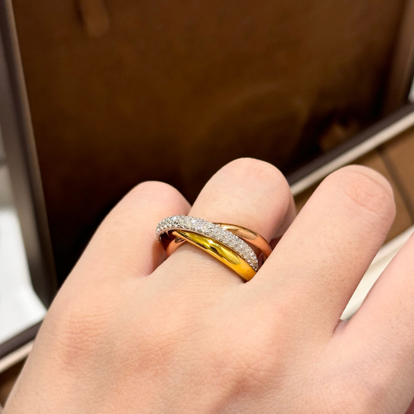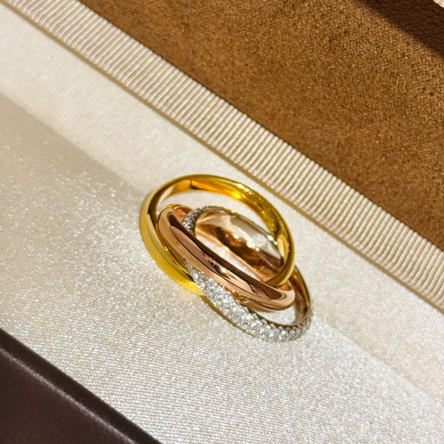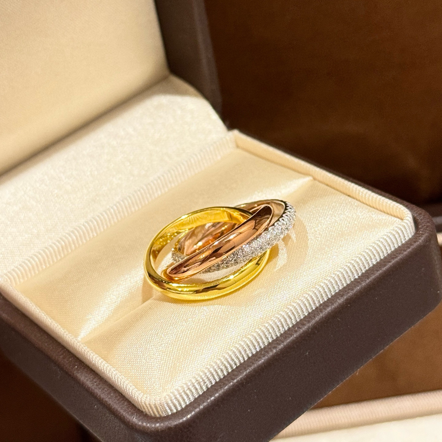 S925银精工带钻三色三圈戒指轻奢三金简约排钻单圈钻高级经典指环