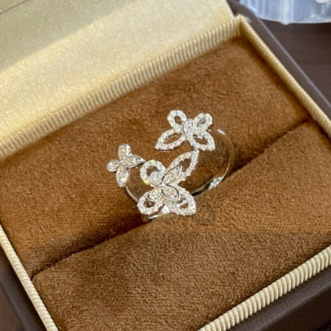 S925纯银精工高级感满钻三只蝴蝶开口戒指轻奢百搭指环女无logo