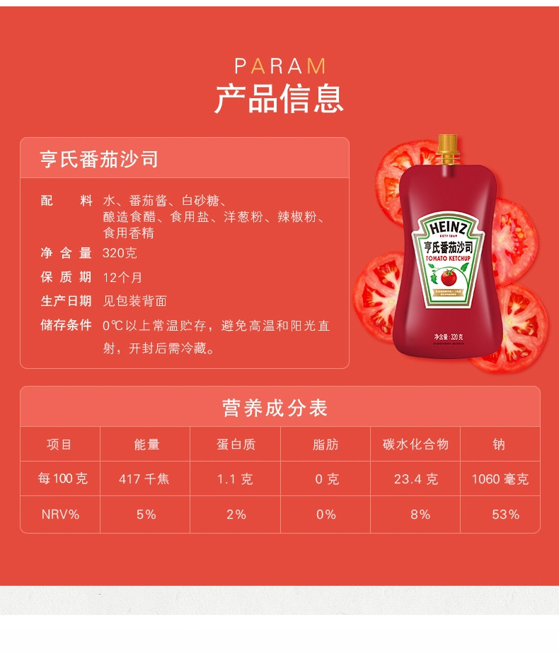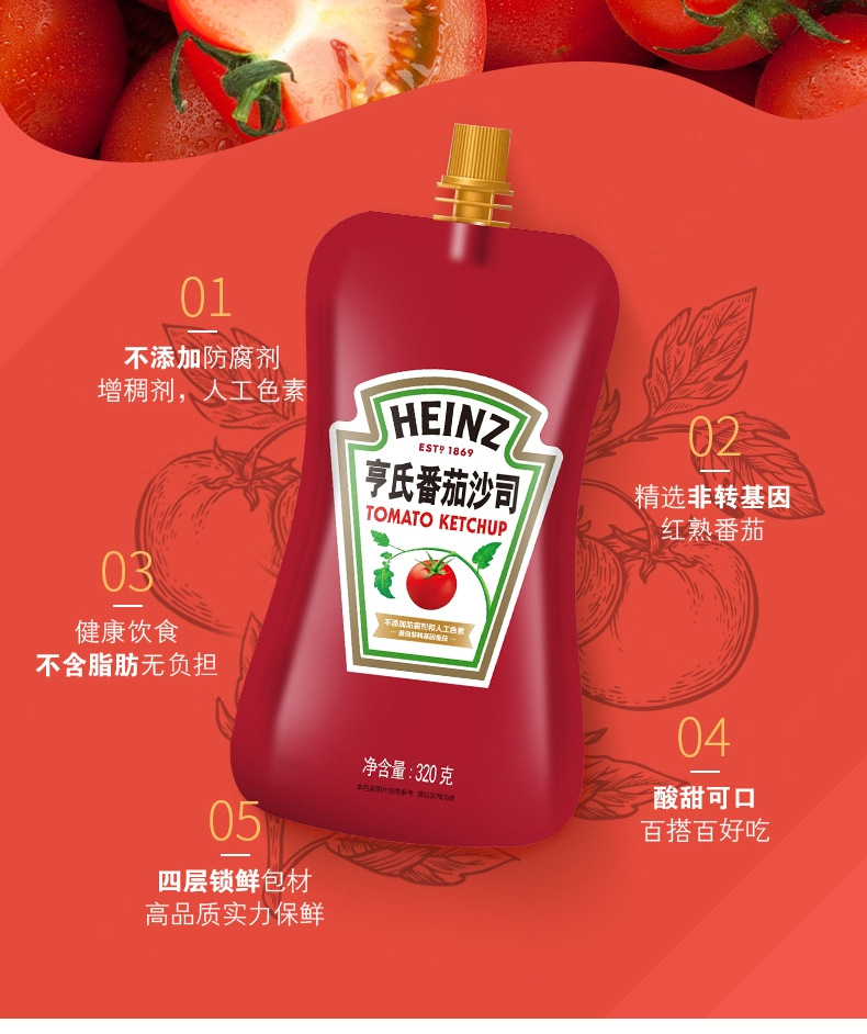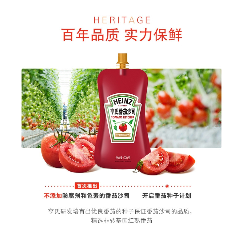 亨氏番茄沙司立袋装320g手抓饼番茄三明治汉堡薯条蘸酱料蕃茄酱