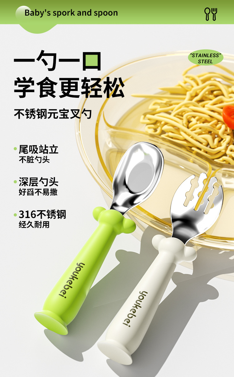 婴儿辅食勺不锈钢元宝勺儿童训练叉勺宝宝学吃饭餐具防滑耐摔叉勺