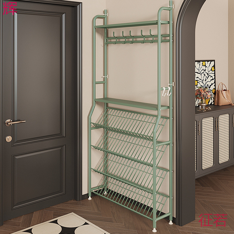 超薄入户门简易鞋架挂衣一体架全金属鞋帽架挂包门口多层置物家用