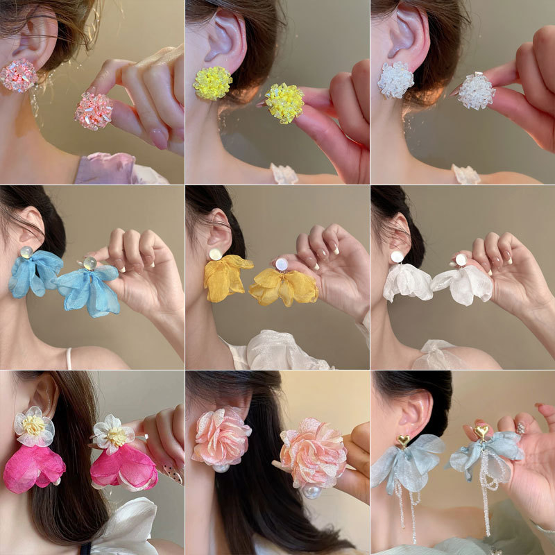 夏涼しいブルービーズアジサイイヤリングフェミニンな生地シフォンフラワーイヤリングイヤークリップ春と夏の休暇