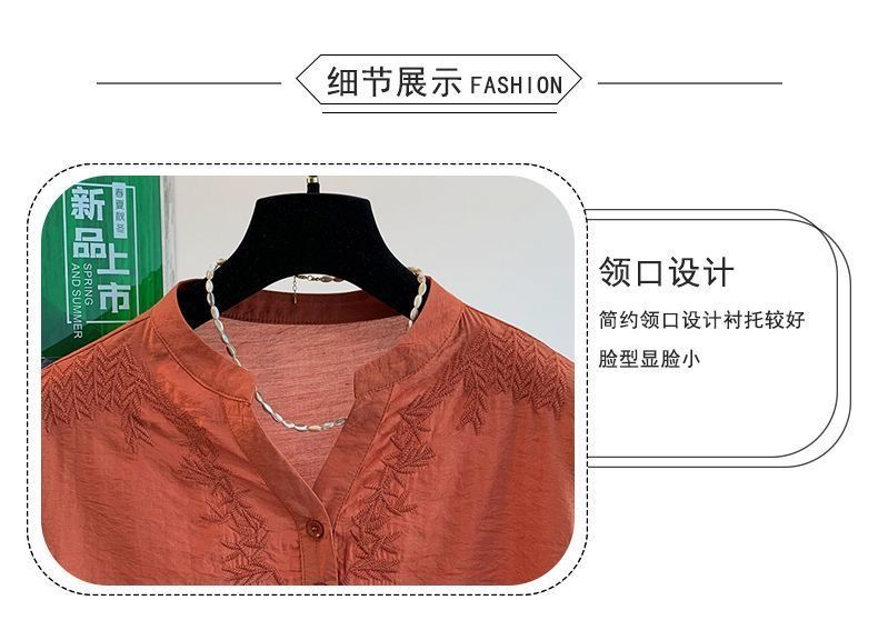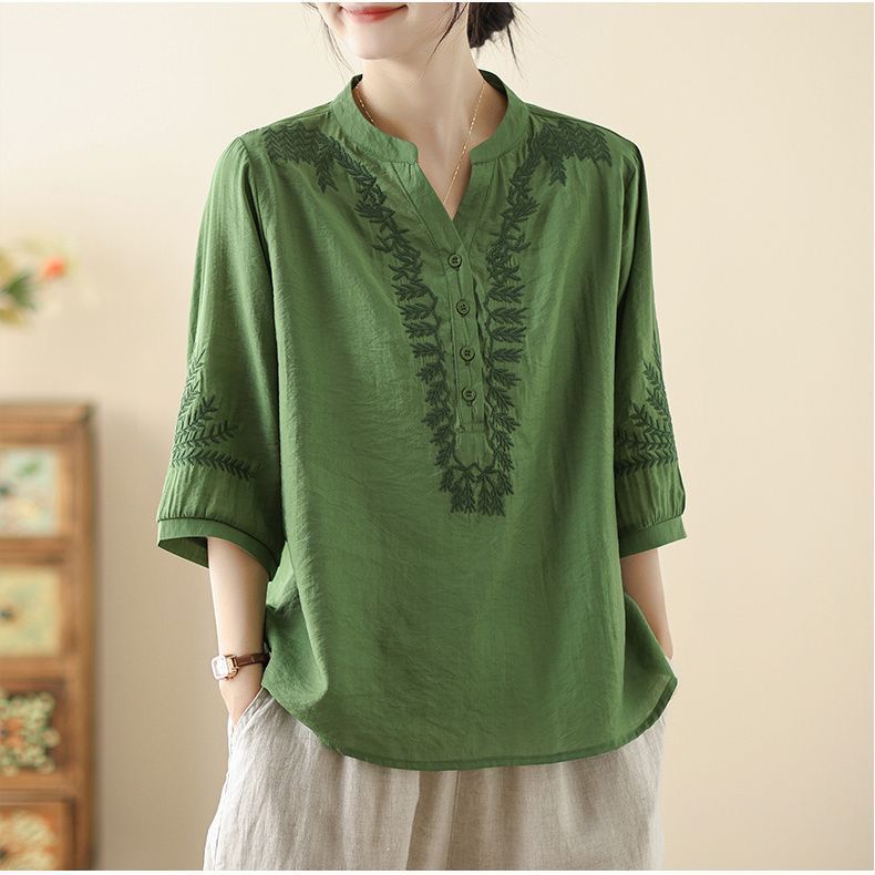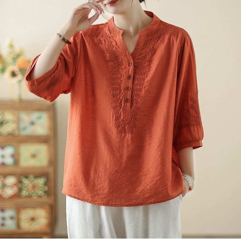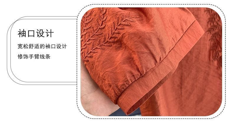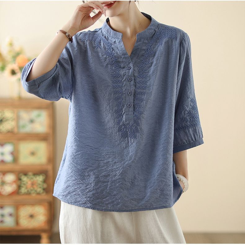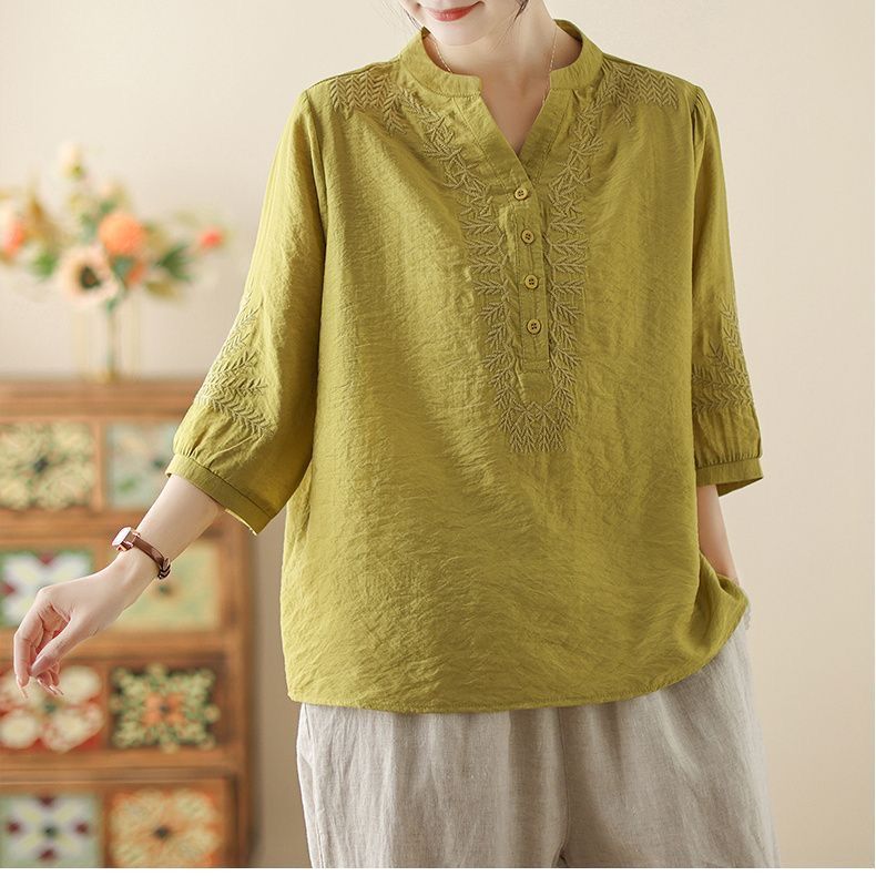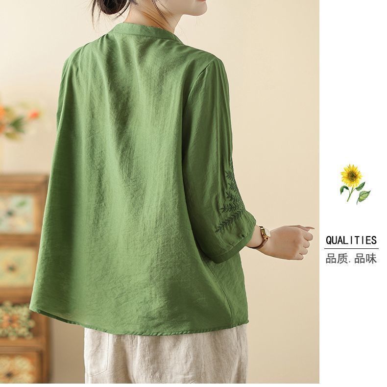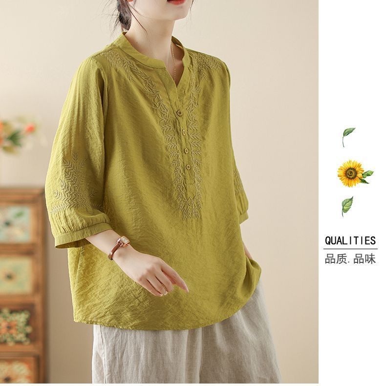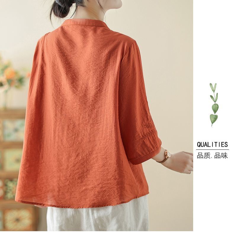 文学レトロ刺繍アイスシルクコットンとリネン Tシャツ夏 2025 新しい国民風大きいサイズルーズトップ多用途女性