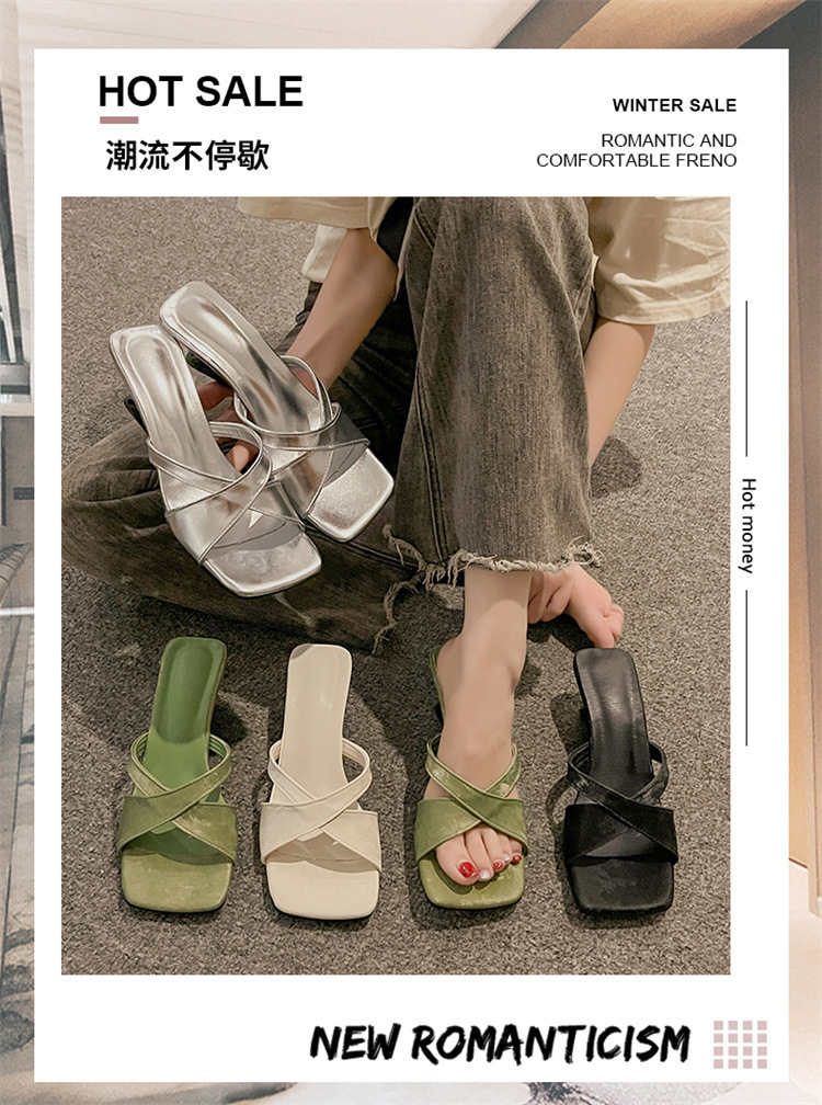 女性用スリッパ 2025 夏の新スタイルフレンチウェッジヒールスクエアトゥサンダルオープントゥ多用途アウターハイヒール