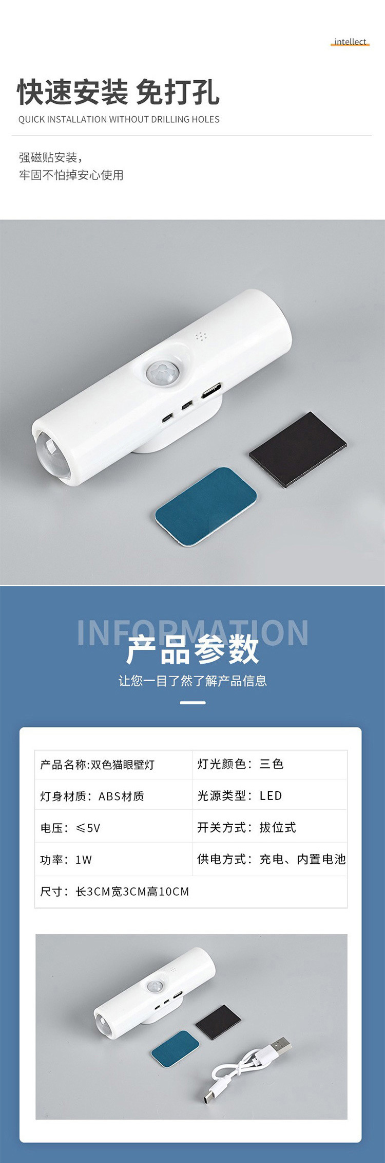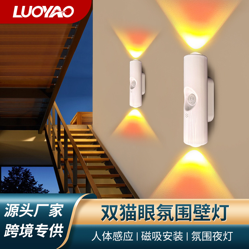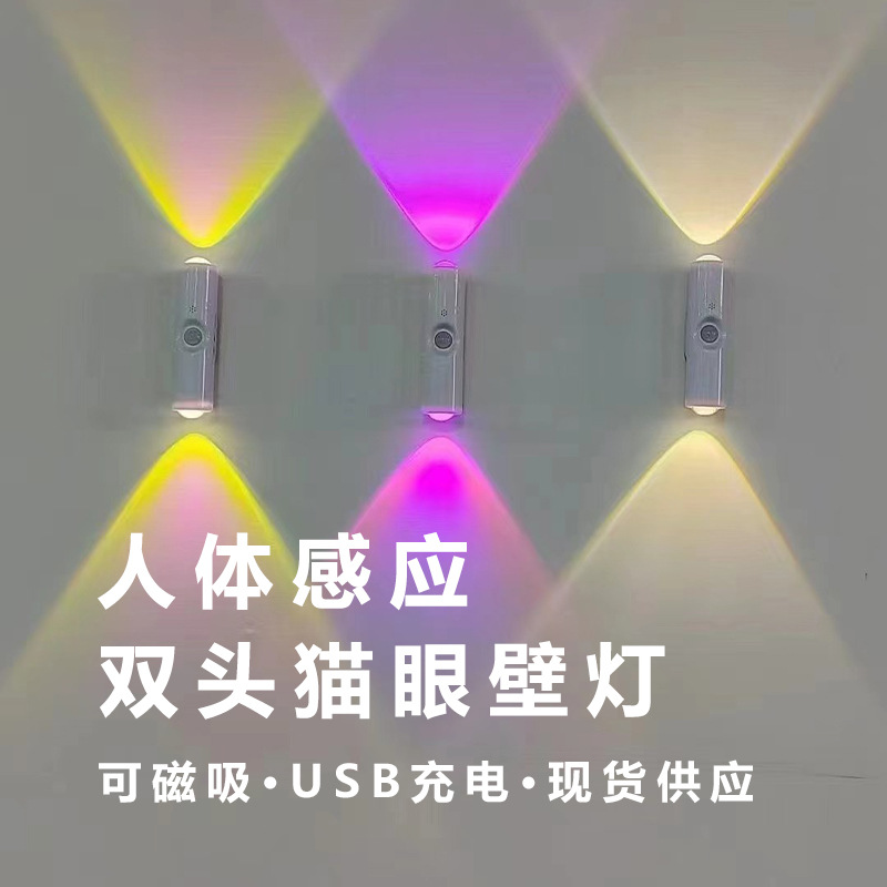 跨境新款智能人体感应灯免打孔磁吸氛围灯充电式小夜灯双猫眼壁灯