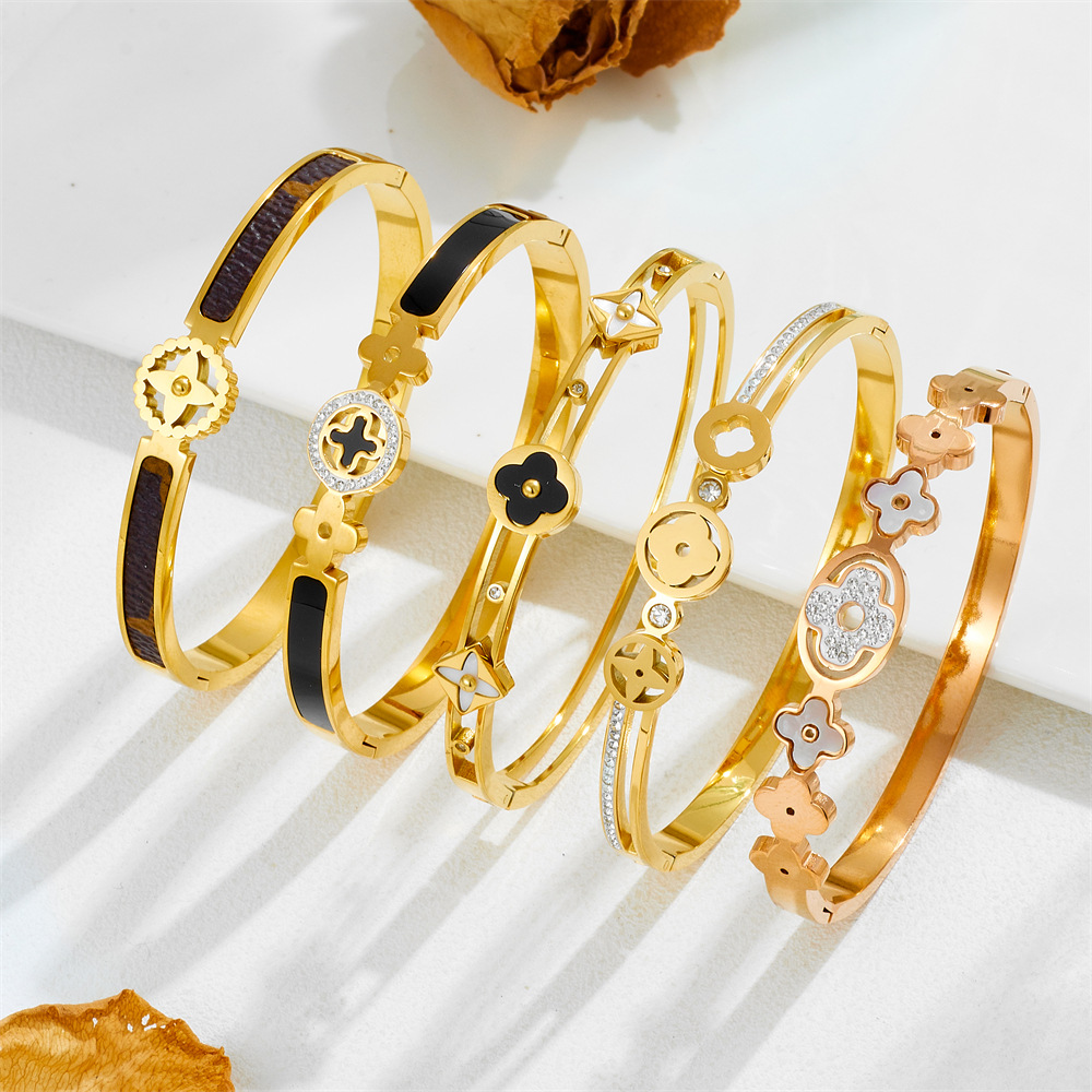 国境を越えた新しい透かし彫りの四つ葉のクローバーのブレスレットの高級感には、チタン鋼のブレスレットの手の輪が軽くて贅沢な雰囲気があります。