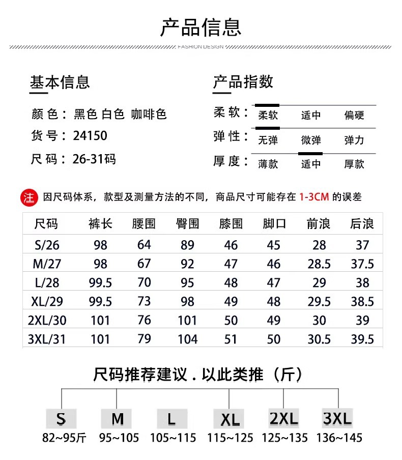 尺码 S【推荐穿85-95斤】,M【推荐穿95-105斤】,L【推荐穿105-115斤】,XL【推荐穿115-125斤】,2XL【推荐穿125-135斤】,3XL 【推荐穿135-145斤】