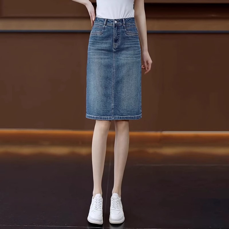 ファッショナブルなハイウエストレトロデニムスカート女性のための夏の薄いスリットAラインスカート痩身ミッドレングスヒップスカートa