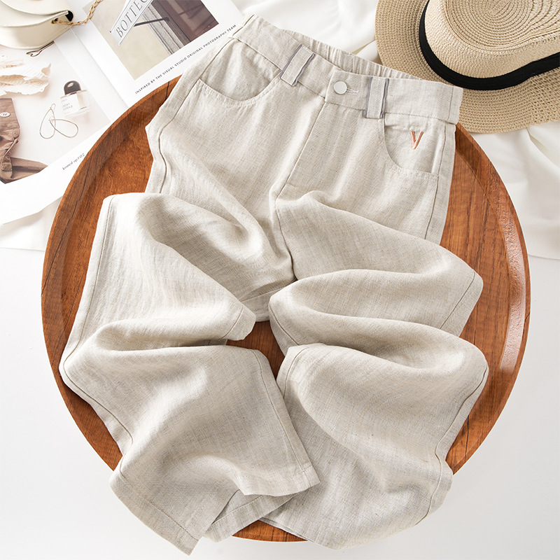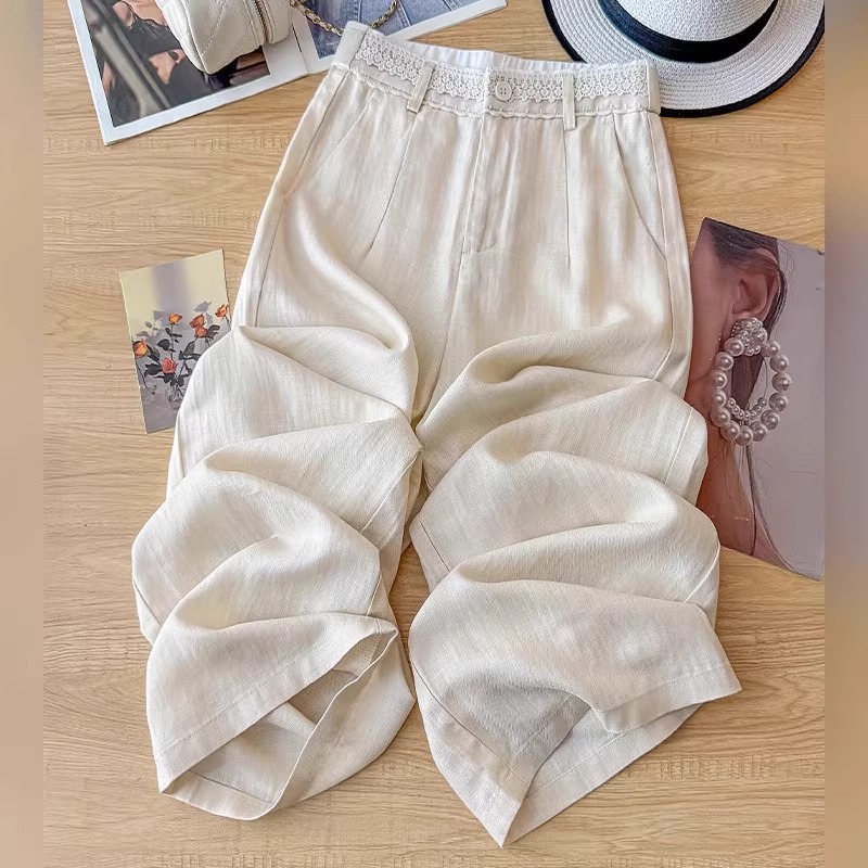 綿とリネンのワイドレッグパンツ女性の夏薄い 2025 新しい通気性カジュアルストレートアイスシルクパンツハイウエストレースリネンパンツ