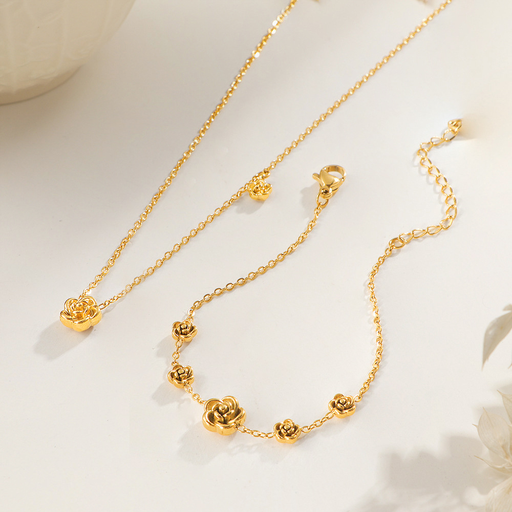 2025新款立体山茶花朵手链女富贵花开项链钛钢不掉色锁骨链套装