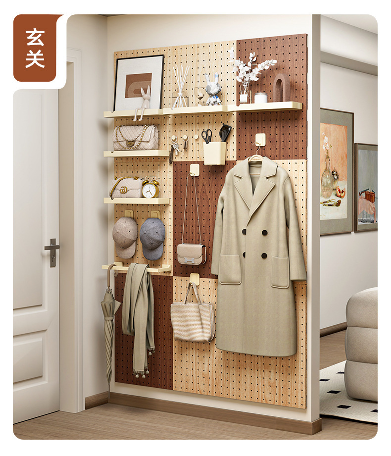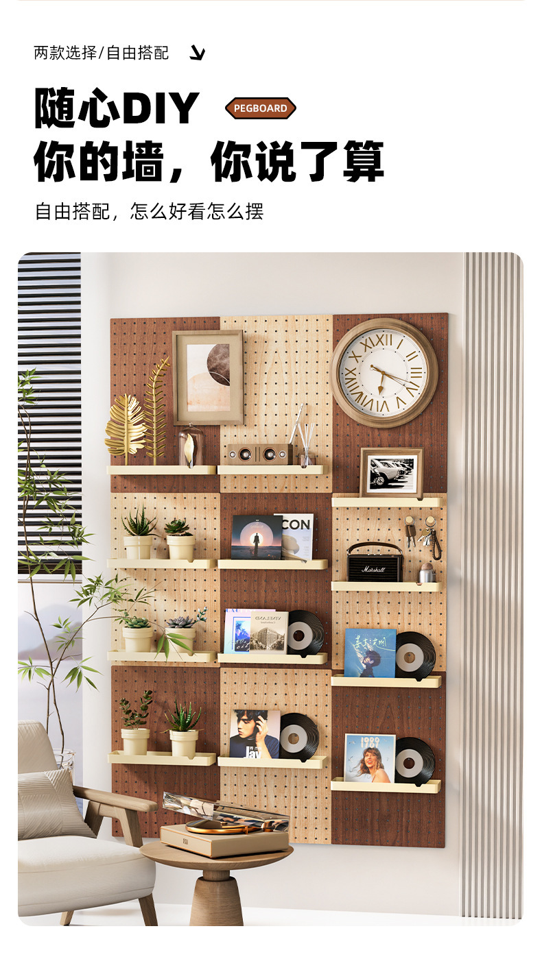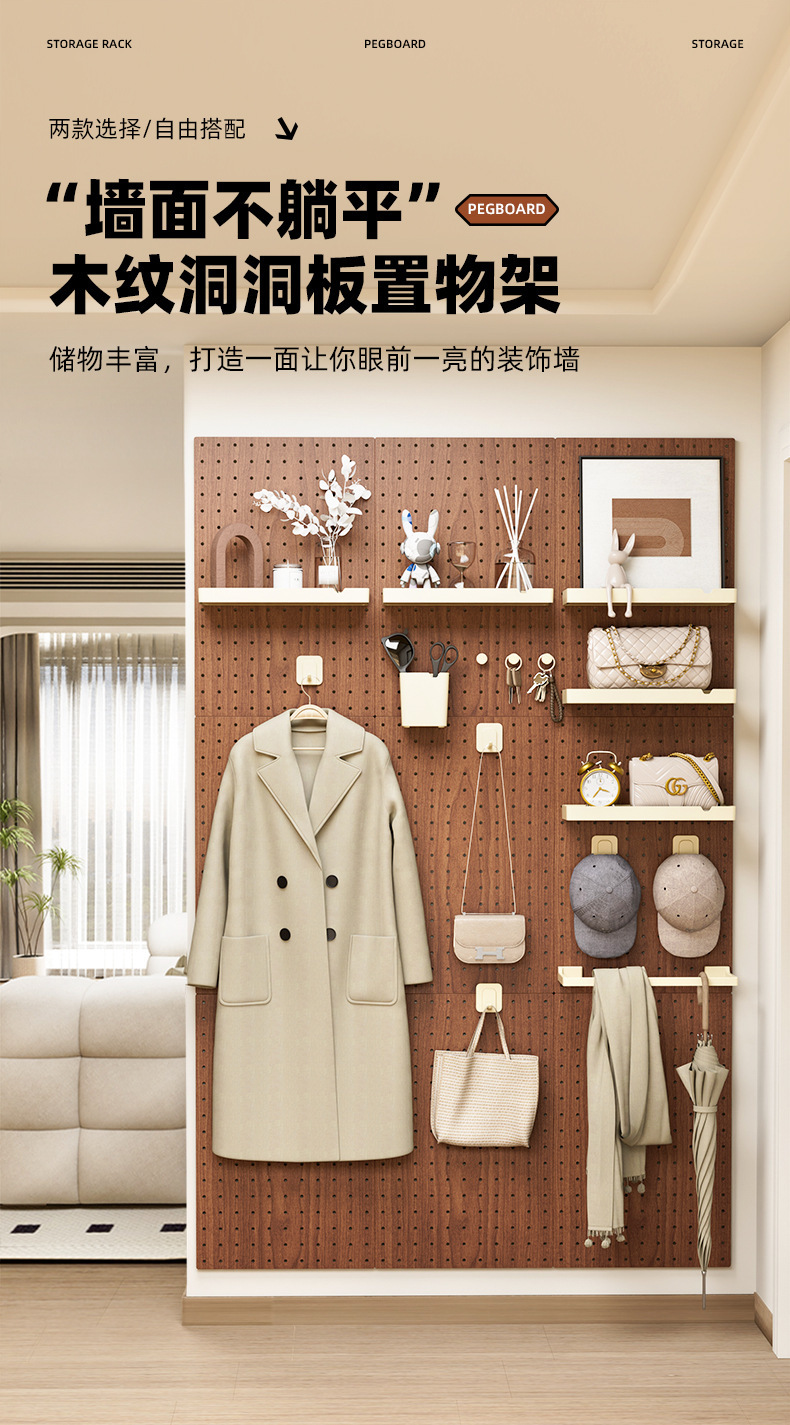 洞洞板实木纹理置物架墙收纳墙上书桌展示架入户门口玄关壁挂式