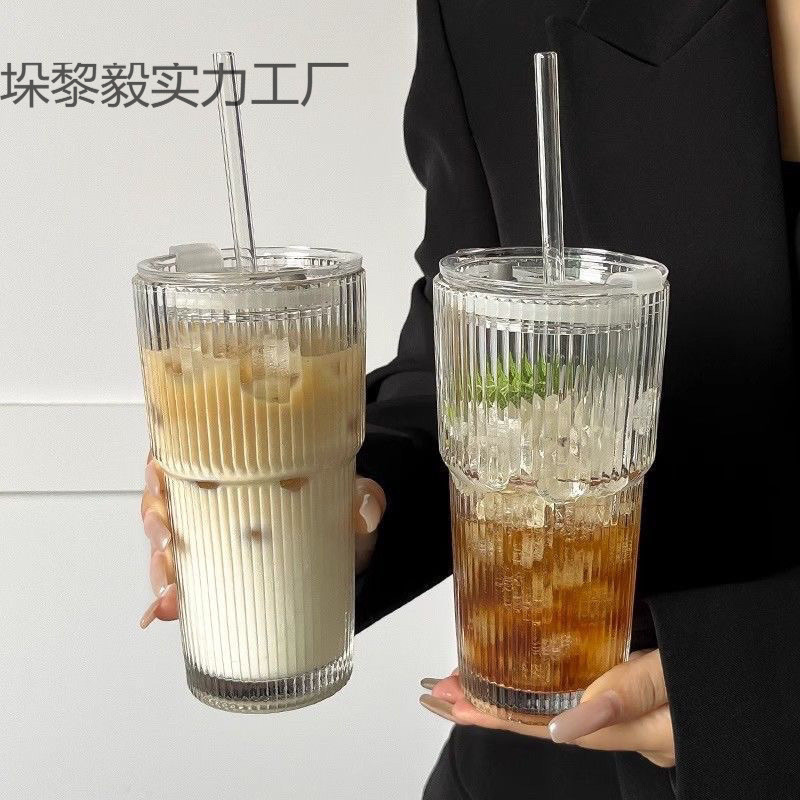 青苹果高颜值冷饮果汁带盖吸管大容量条纹玻璃杯水杯ins