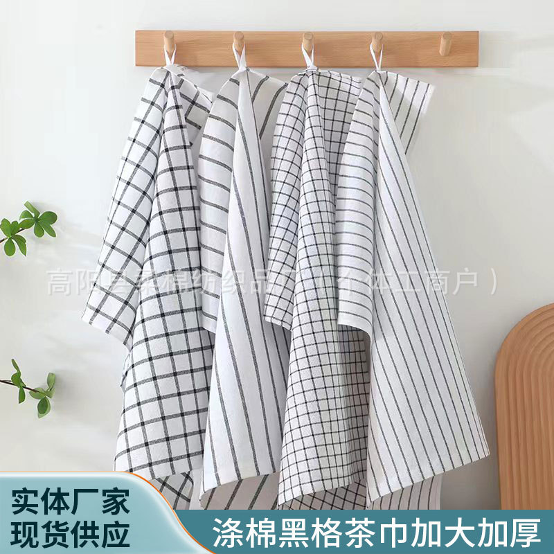 跨境货源涤棉黑格子茶巾批发涤棉混纺吸水快干厨房洗碗布代贴条码