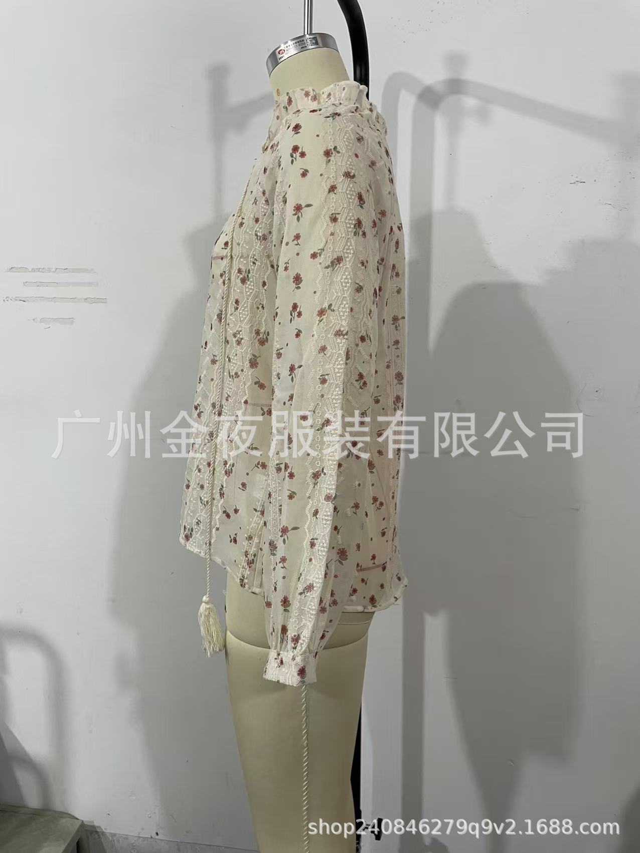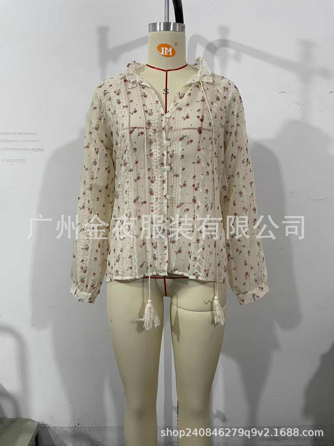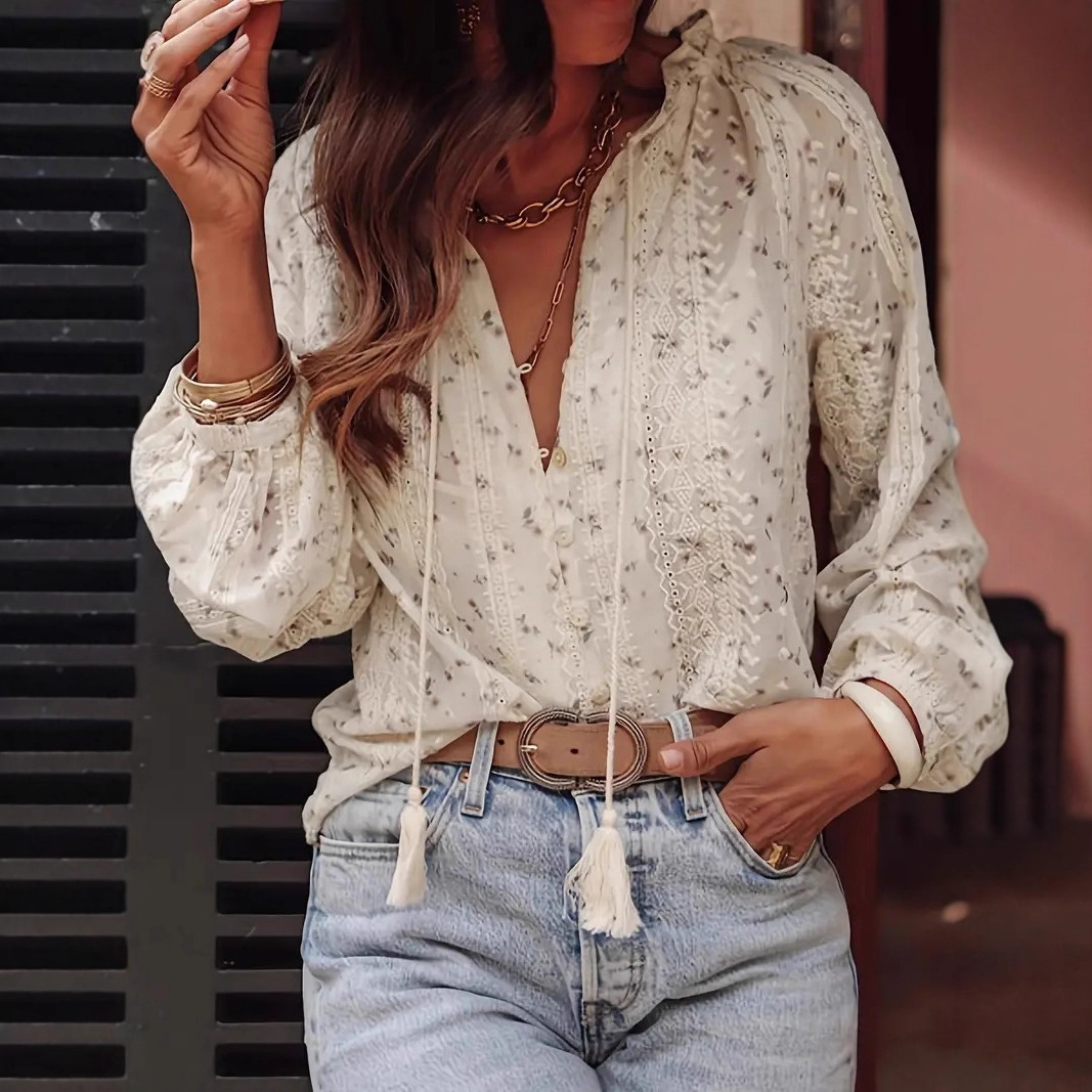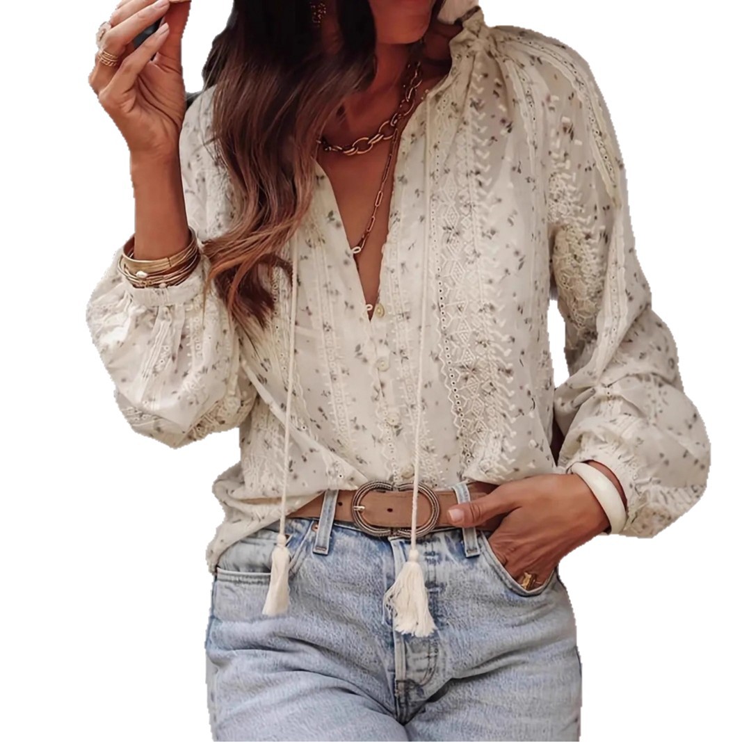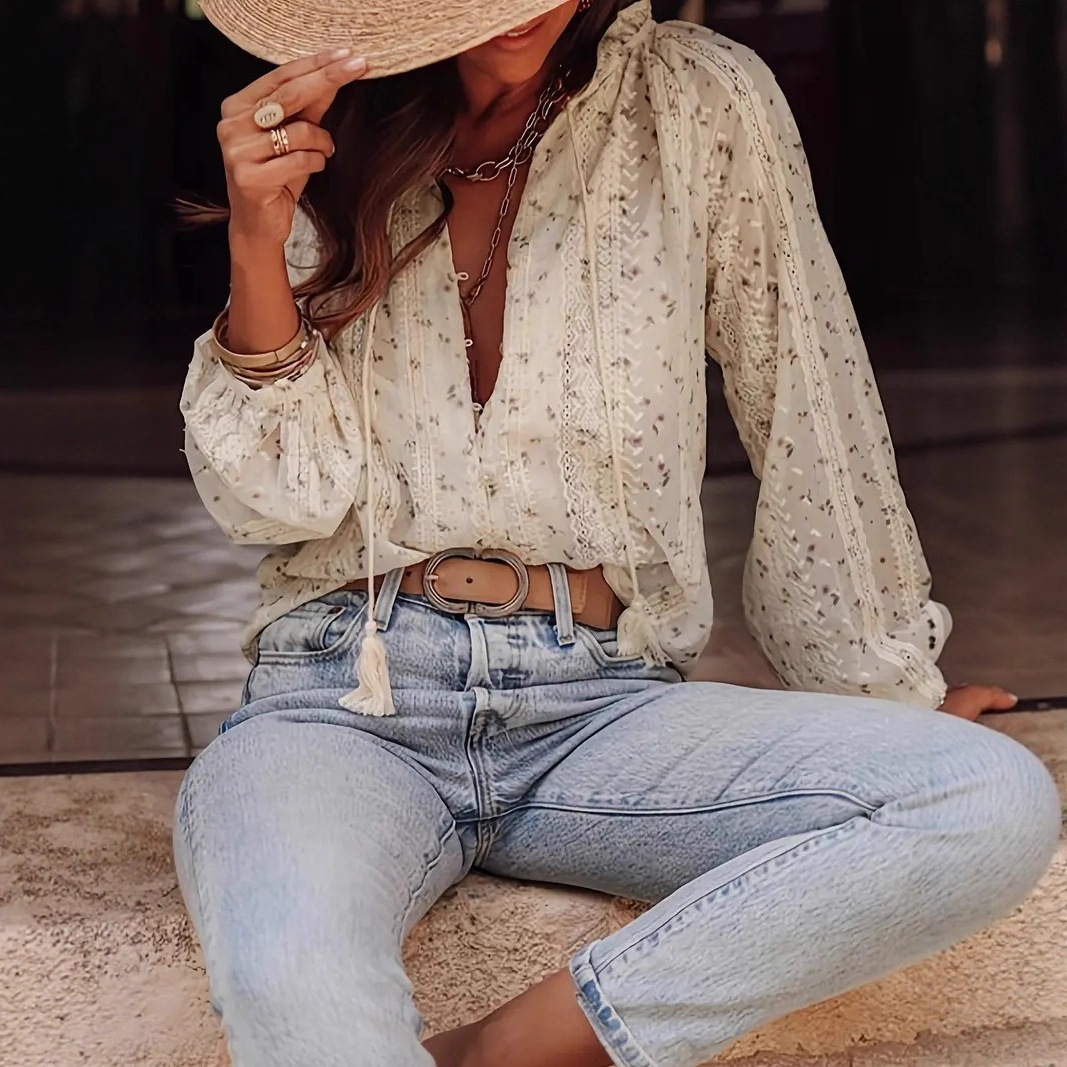 2025欧美跨境外贸女装优雅气质时尚碎花印花蕾丝拼接流苏衬衫衬衣