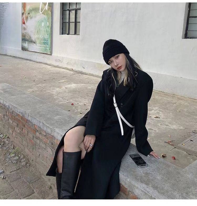 女性のための黒のウールコート 2025 新しい秋と冬のハイエンドウールコート韓国スタイルの右肩ミッドレングストレンディ