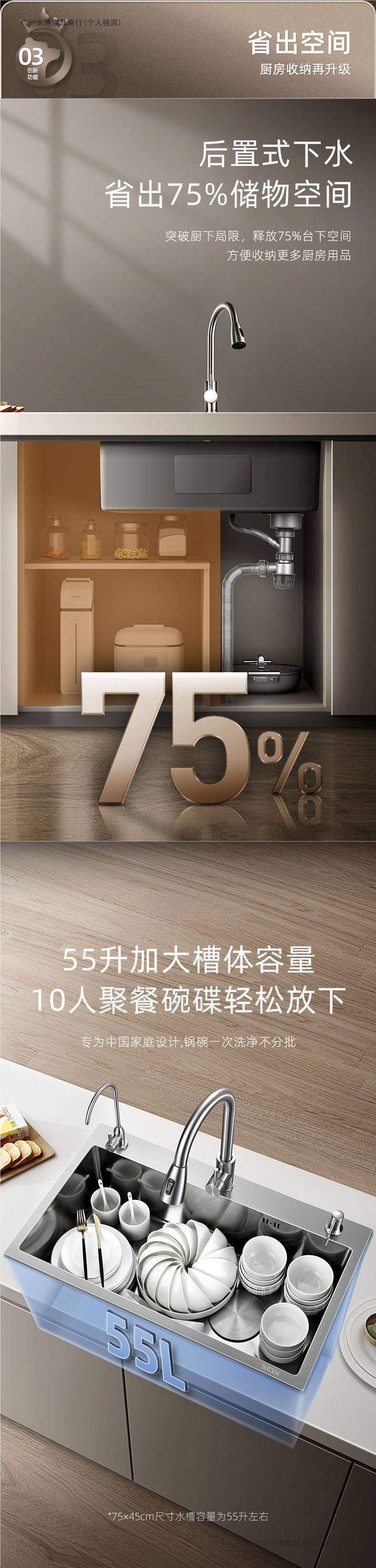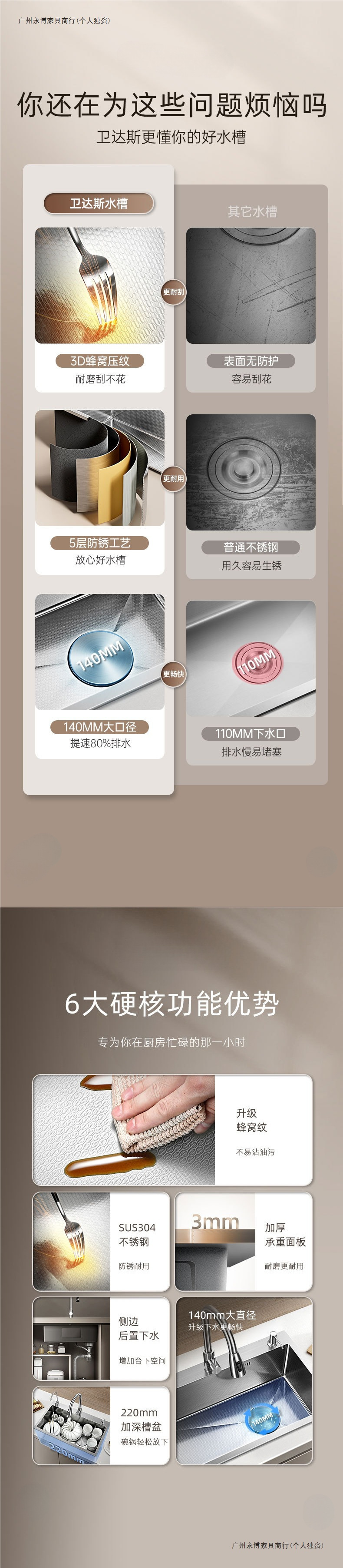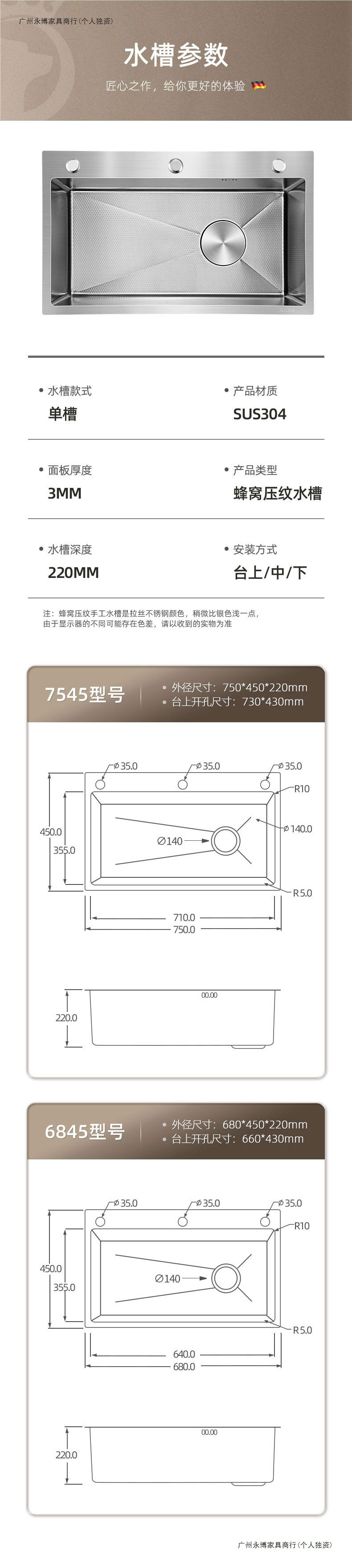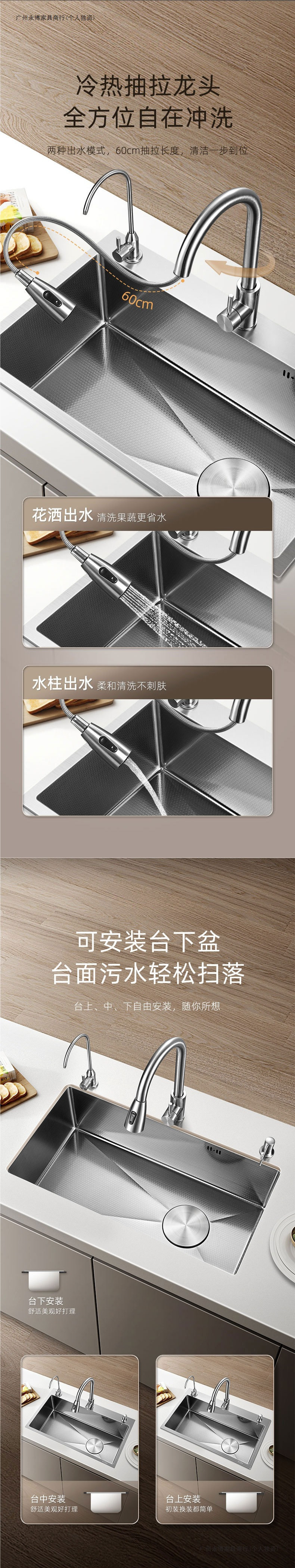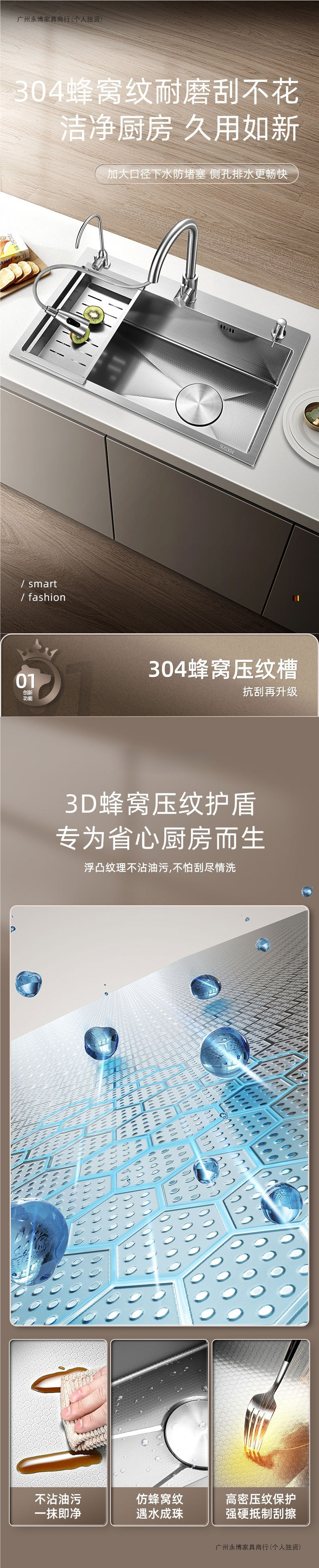 鲸鱼瀑布多功能水槽蜂窝压纹304不锈钢厨房大单槽洗菜盆洗碗池
